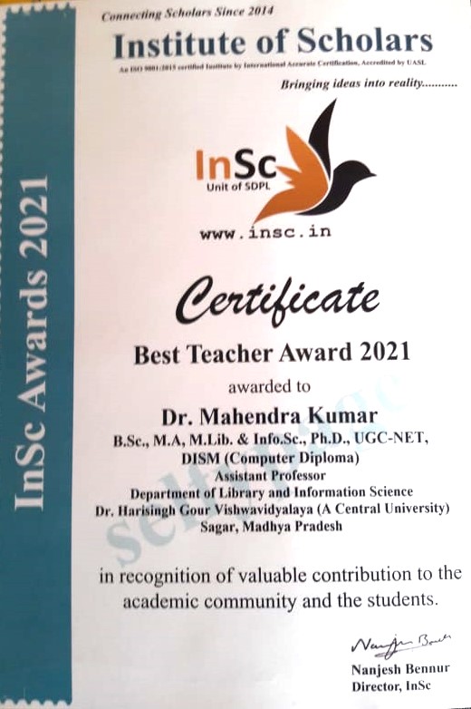 Best Paper and Presentation at the National Conference on Role of Academic Libraries for Excellence in research organising by IISER,Bhopal |