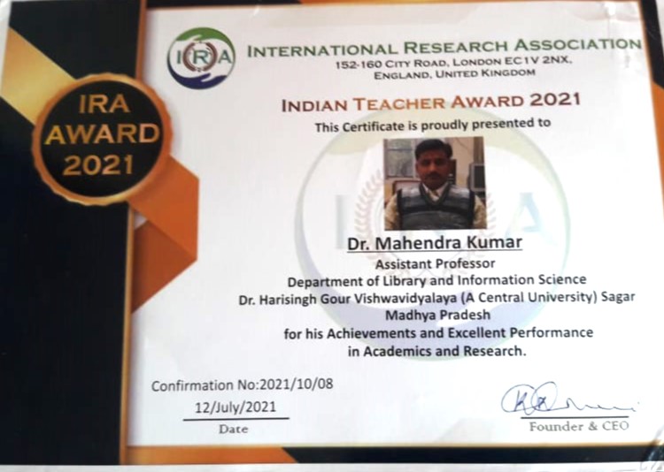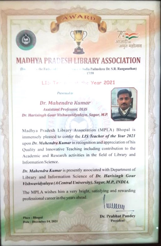 Dr. Ram Gopal Garg Memorial Award for LIS Teacher (2017) |