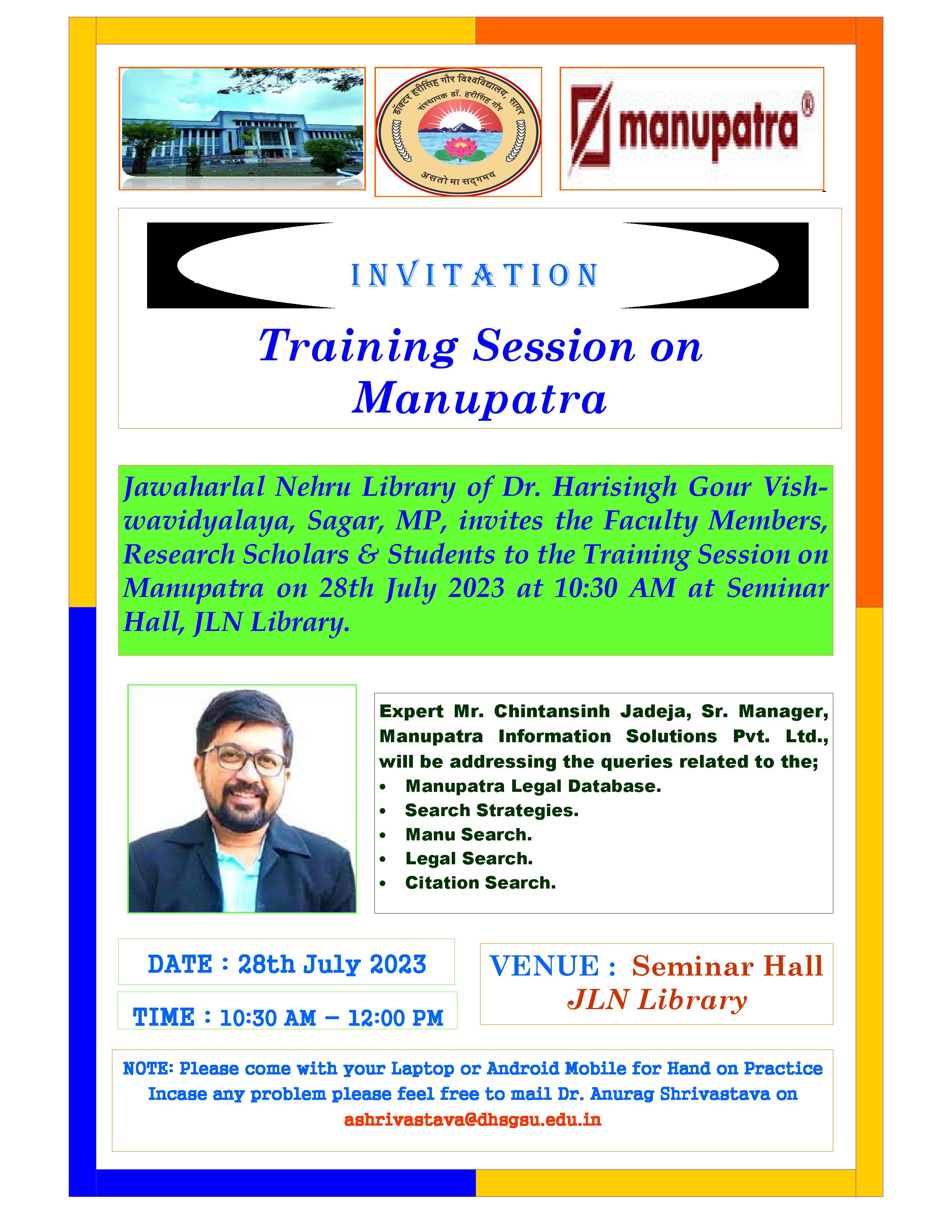 Training Session on Manupatra on 28th July 2023 at Seminar Hall, JLN Library at 10:30 AM |