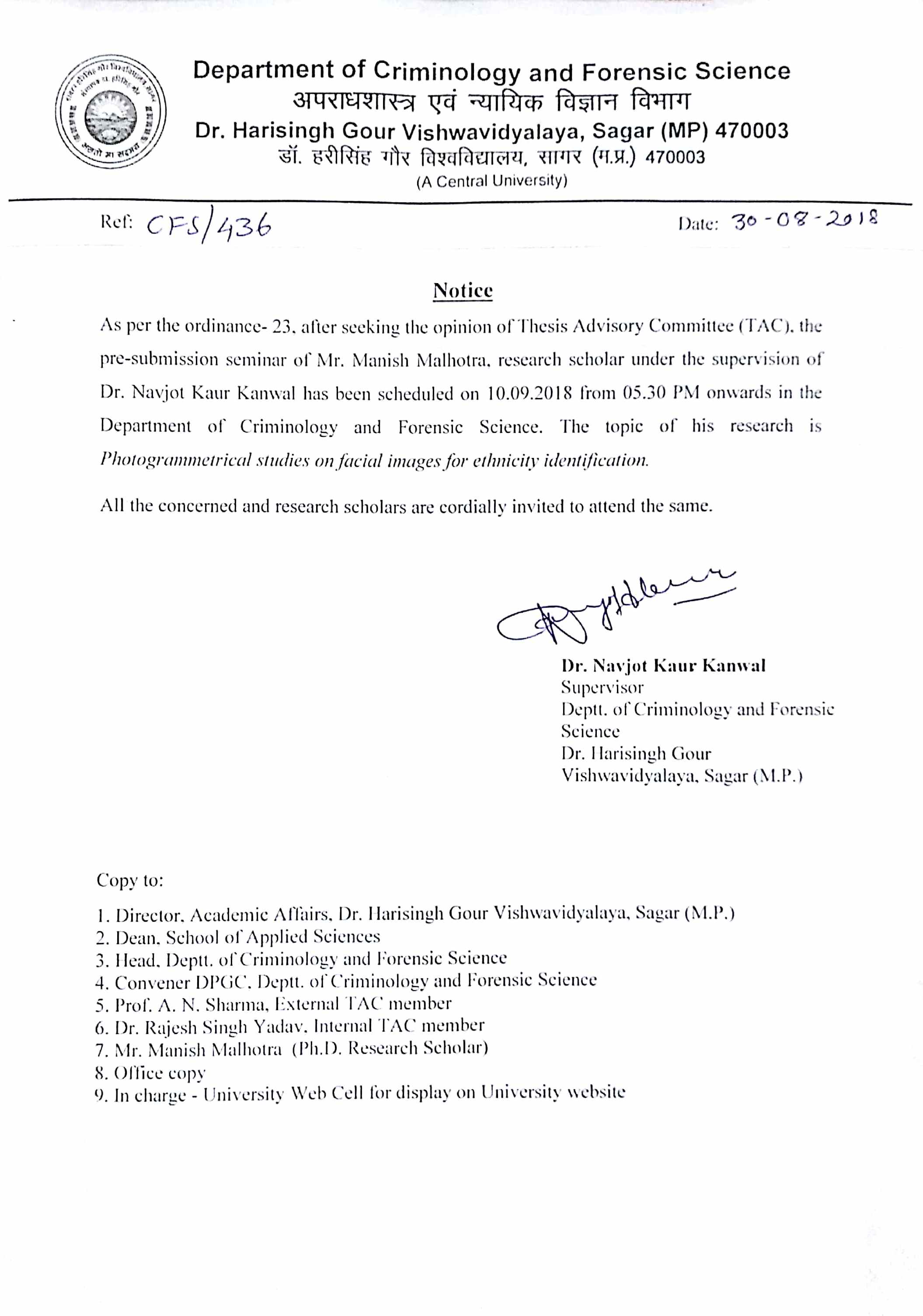 The Pre-submission Seminar of Manish Malhotra , 10 Sep. 2018 DCFS “Dept. of Criminology & F.Sc.”- (Disp.No. CFS /436,Dt.30-08-2018)