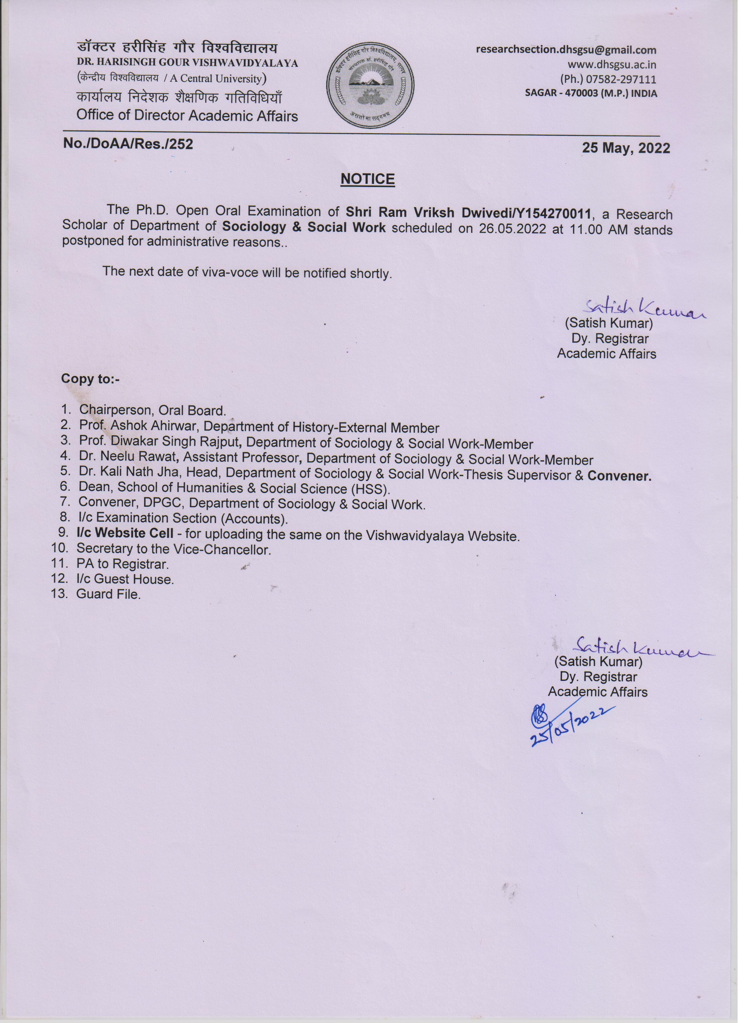 - Notice: The Ph.D. Open Oral Examination of Shri Ram Vriksh Dwidedi on 26-05-2022 Research Scholar Department of Sociology & Social Work