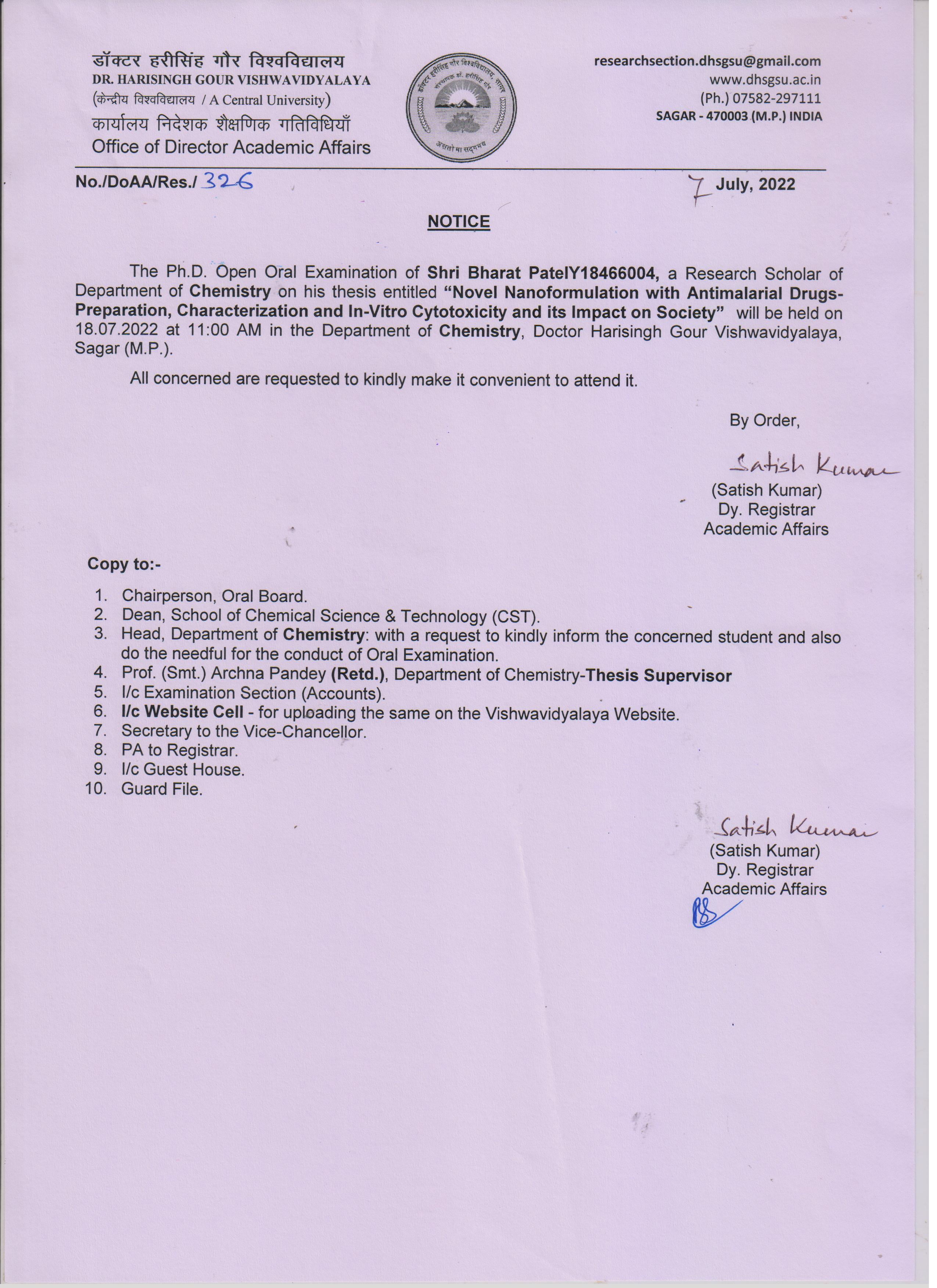 Notice: The Ph. D.Open Oral Examination of Shri Bharat Patel on 18-07-2022 Department of Chemistry -(Research Section ) -(by mail-DispNo. DoAA/Res./326,Dt.07-07-2022) पूर्ण जानकारी हेतु संलग्नक देखे