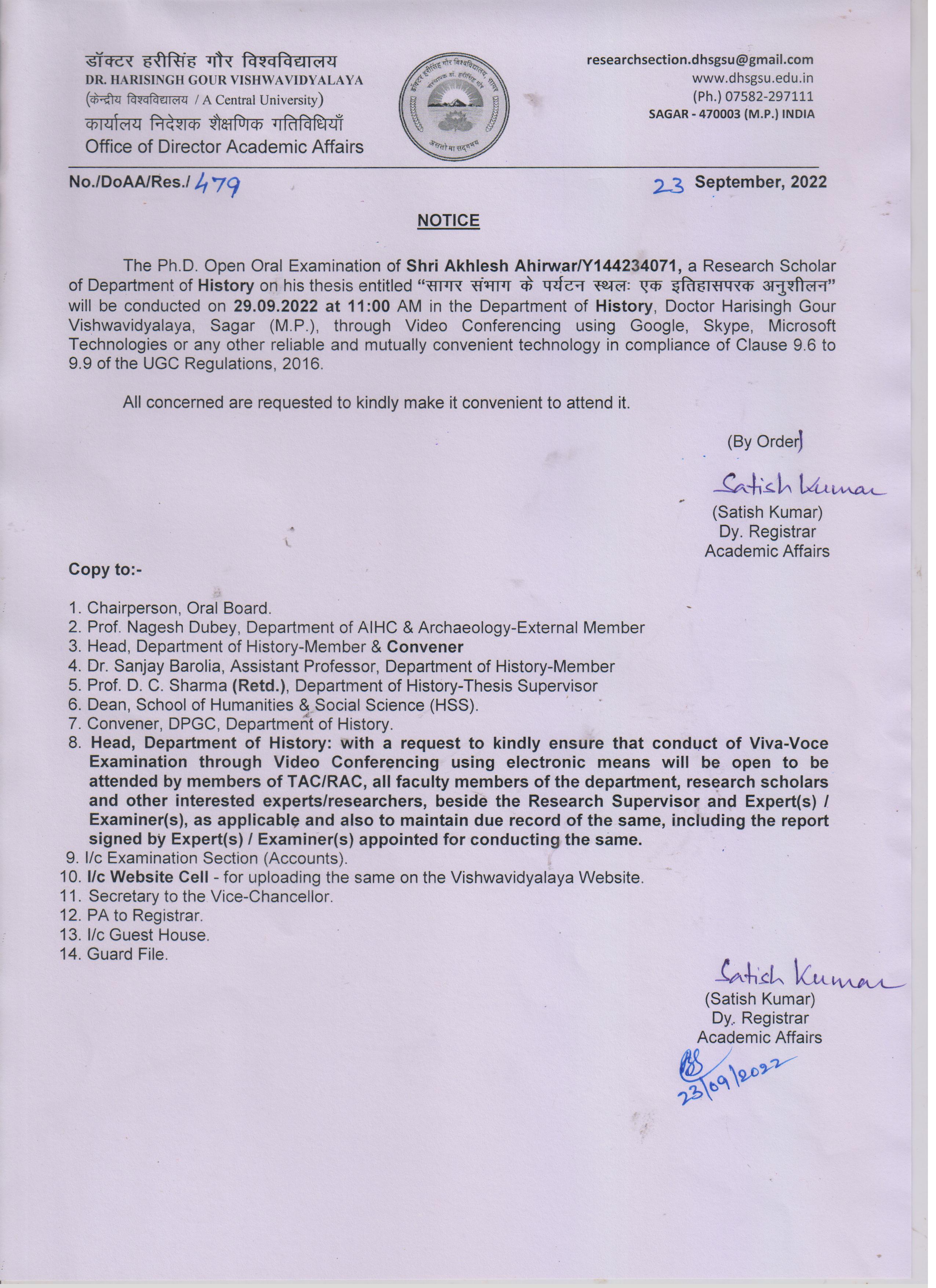 - Notice: The Ph.D. Oral Open Examination of Shri Akhlesh Ahirwar on 29-09-2022 Department of History -“Research Section ” - (DispNo.DoAA/Res/479,Dt.23-09-22) पूर्ण जानकारी हेतु संलग्नक देखे