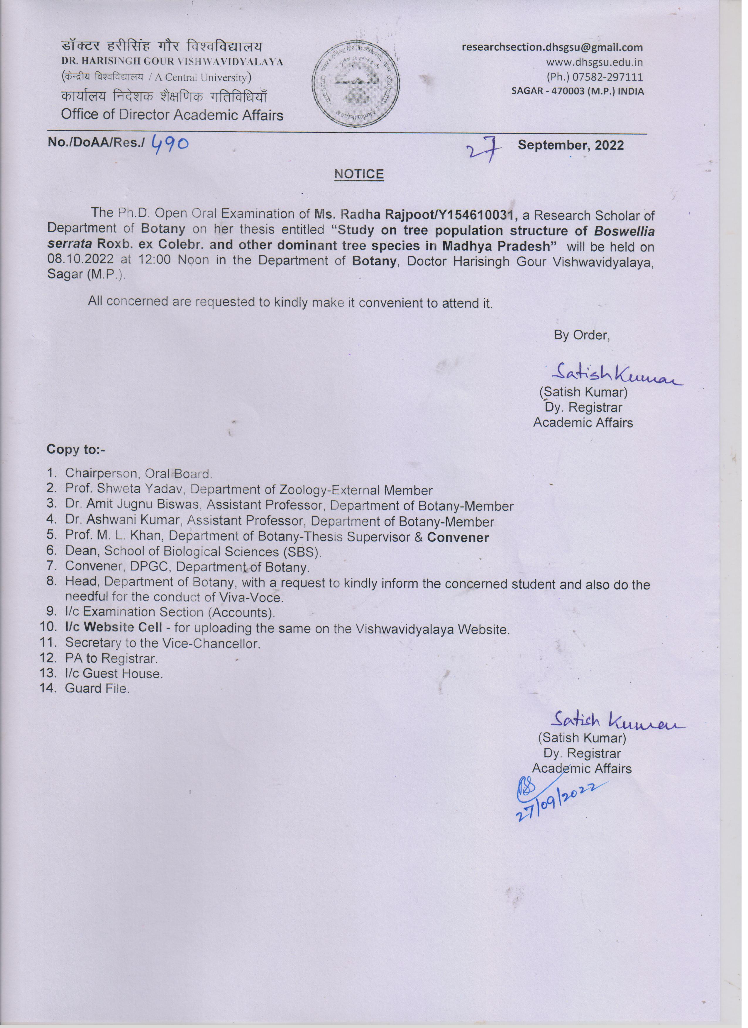 Notice: The Ph.D. Open Oral Examination of Ms. Radha Rajpoot on 08-10-2022 Department of Botany -“Research Section” - (DispNo.DoAA/Res/490,Dt.27-09-22) पूर्ण जानकारी हेतु संलग्नक देखे