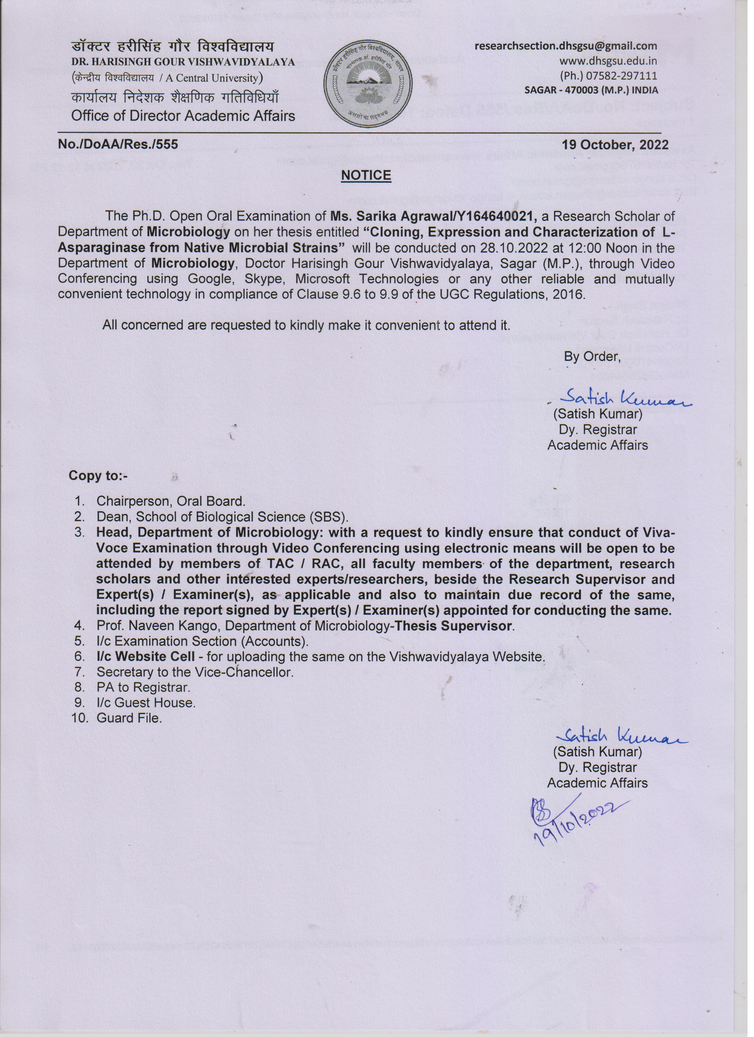 - Notice: The Ph.D. Open Oral Examination of Ms. Sarika Agrawal on 28-10-2022 Department of Microbiology “Research Section” -(DispNo.DoAA/Res./555,Dt.19/21-10-22) पूर्ण जानकारी हेतु संलग्नक देखे