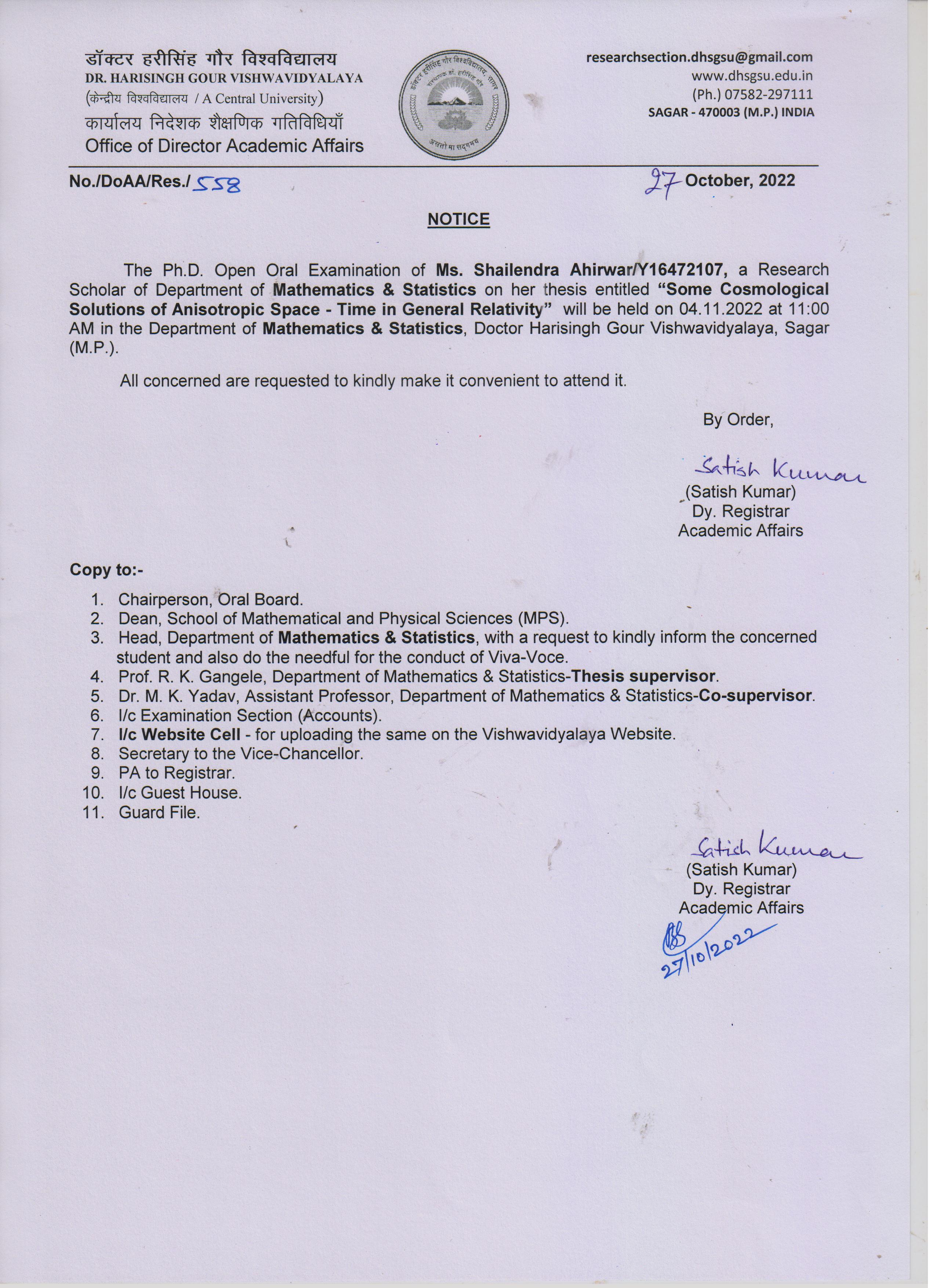 - Notice: The Ph.D. Open Oral Examination of Ms. Shailendra Ahirwar on 04-11-2022 Department of Mathematics & Statistics “Research Section” -(DispNo. DoAA/Res/558,Dt.27-10-22) पूर्ण जानकारी हेतु संलग्नक देखे