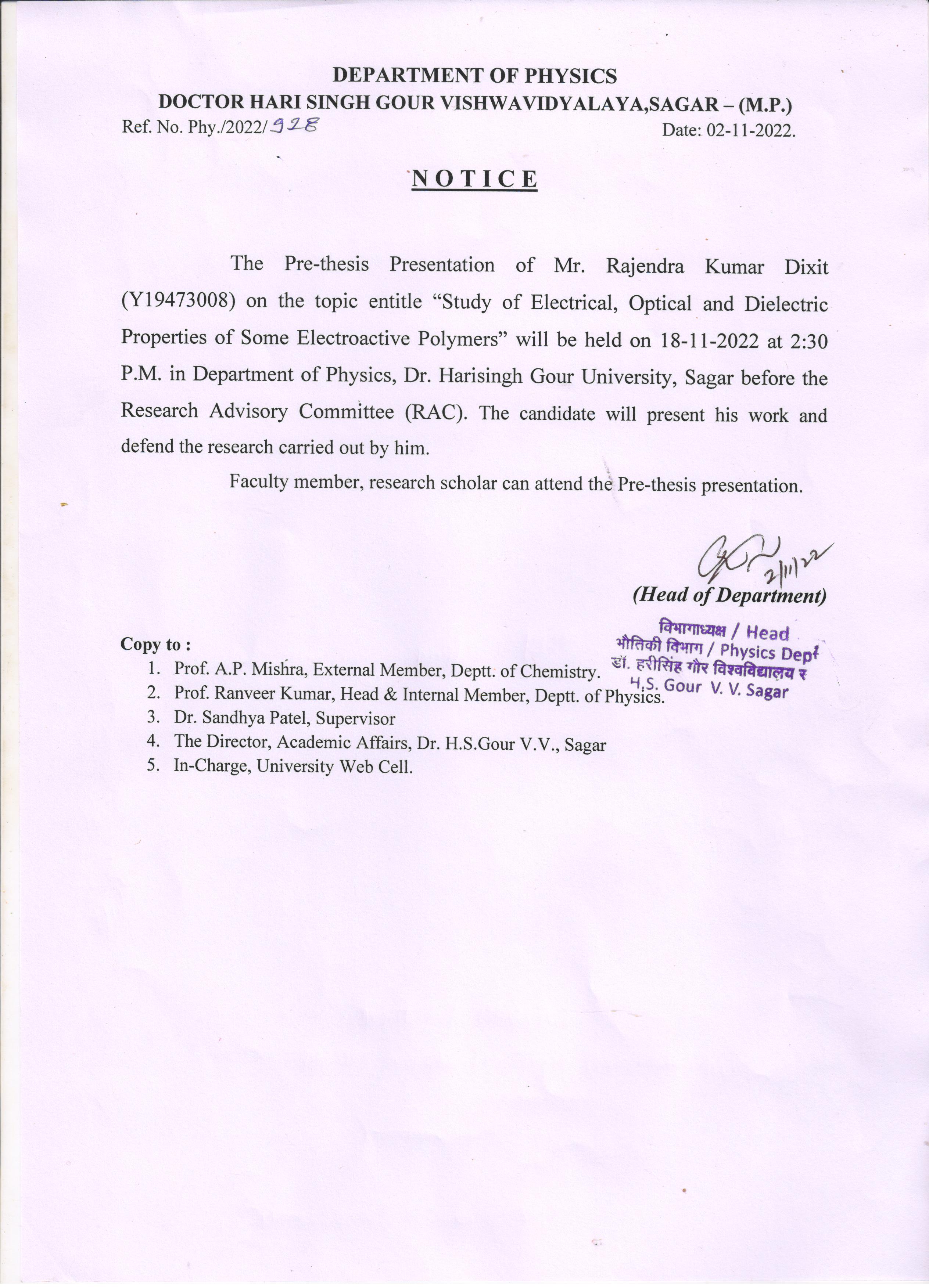 - Notice: The Pre-thesis Presentation of Mr. RAjendra Kumar Dixit on 18-11-2022 Department of Physics