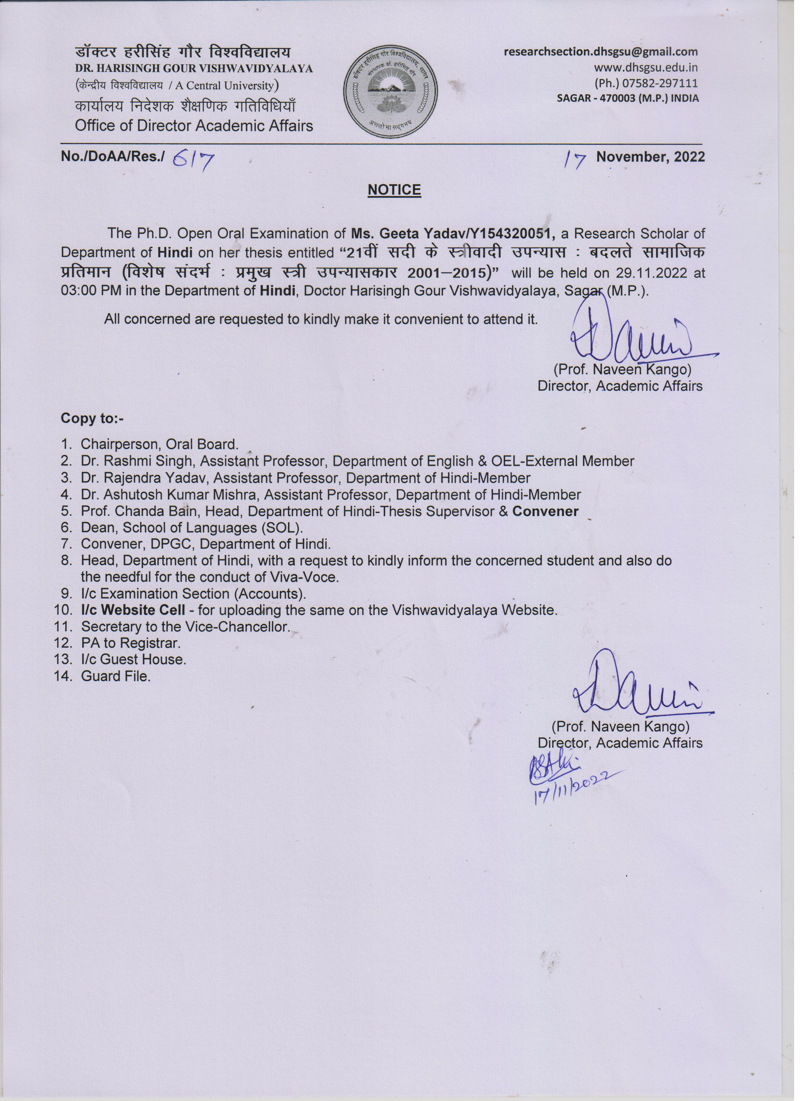 - Notice: The Ph.D. Open Oral Examination of Ms. Geeta Yadav on 29-11-2022 Department of Hindi “DOAA Office” -(DispNo.DOAA/Res/617,Dt.17/21-11-22) पूर्ण जानकारी हेतु संलग्नक देखे