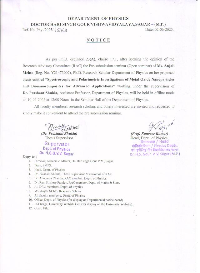 Notice: Pre-Submission seminar of Ms. Anjali Mehto on 10-06-2025 Department of Physic "Dept. Physic" "Disp.No.--/1569,,Dt.02-06-2025" पूर्ण जानकारी हेतु संलग्नक देखे