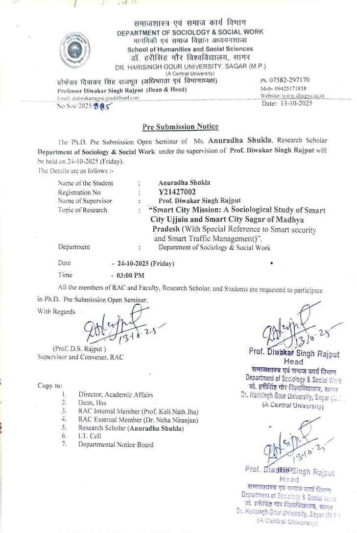 Notice: Pre-Submission Open Seminar Anuradha Shukla Date 24-10-2025 Department of Sociology and Social Work “Dept. Sociology" "Disp.No.-/885,Dt.13-10-2025" पूर्ण जानकारी हेतु संलग्नक देखे