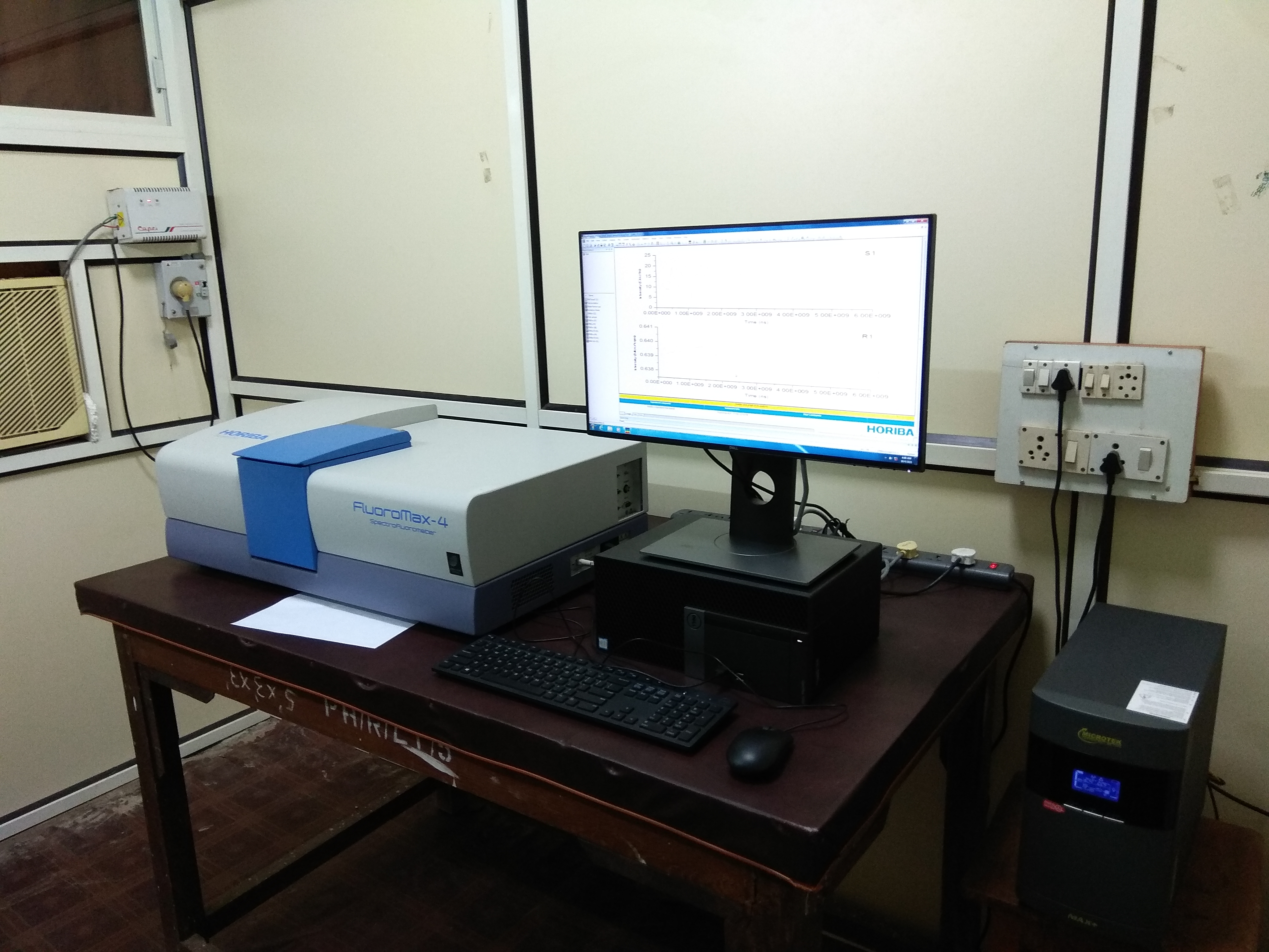 Fluorescence spectrometer (Model name Fluoromax-4) working in the wavelength range from 200 nm to 1100 nm. The spectrometer can be used to record excitation spectra and emission spectra. The instrument can also be used to record the decay profile of the fluorescent material. It works on the principle of backscattering mode. The resolution of the fluorescent spectrometer is 0.5 nm. It can record fluorescence spectra of both solid and liquid samples. In this instrument, there are two bandpass filters of wavelengths 320 nm, 370 nm, and five cut-off filters having wavelengths 370nm, 399nm, 450nm, 500nm, and 550 nm. These filters are used to remove overtones from the emission spectrum. This instrument is used to analyze the optical properties of the materials.