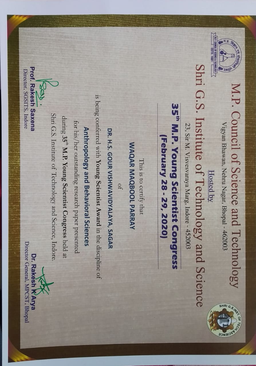 | 1 | Waqar Maqbool Parray | Young Scientist Award | M.P. Council of Science and Technology | 29-02-2020 | Click Here |