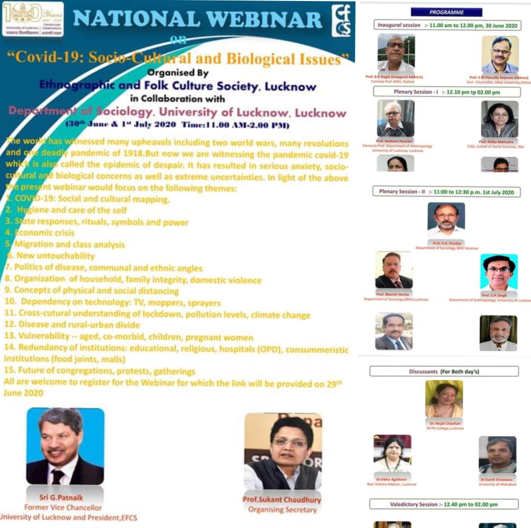 Delivered Invited online Lecture on “Covid – 19 : Women’s Issues” on o1/07/ 2020, National Webinar (June 30-July01, 2020) on Covid-19: Socio-Cultural and Biological Issues” organized by Ethnographic and Folk Culture Society, Lucknow in Collaboration with Department of Sociology, University of Lucknow, Lucknow |