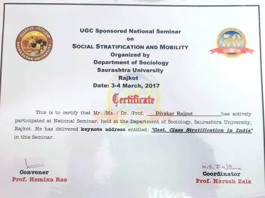 | Prof. Diwakar Singh Rajput | Delivered lecture in Keynote address entitled: "Cast, Class Stratification in India" UGC Sponsored National Seminar on Social Stratification AND Mobility Organized by Department of Sociology Saurashtra University Rajkot | 03-03-2017 To 04-03-2017 | Download |