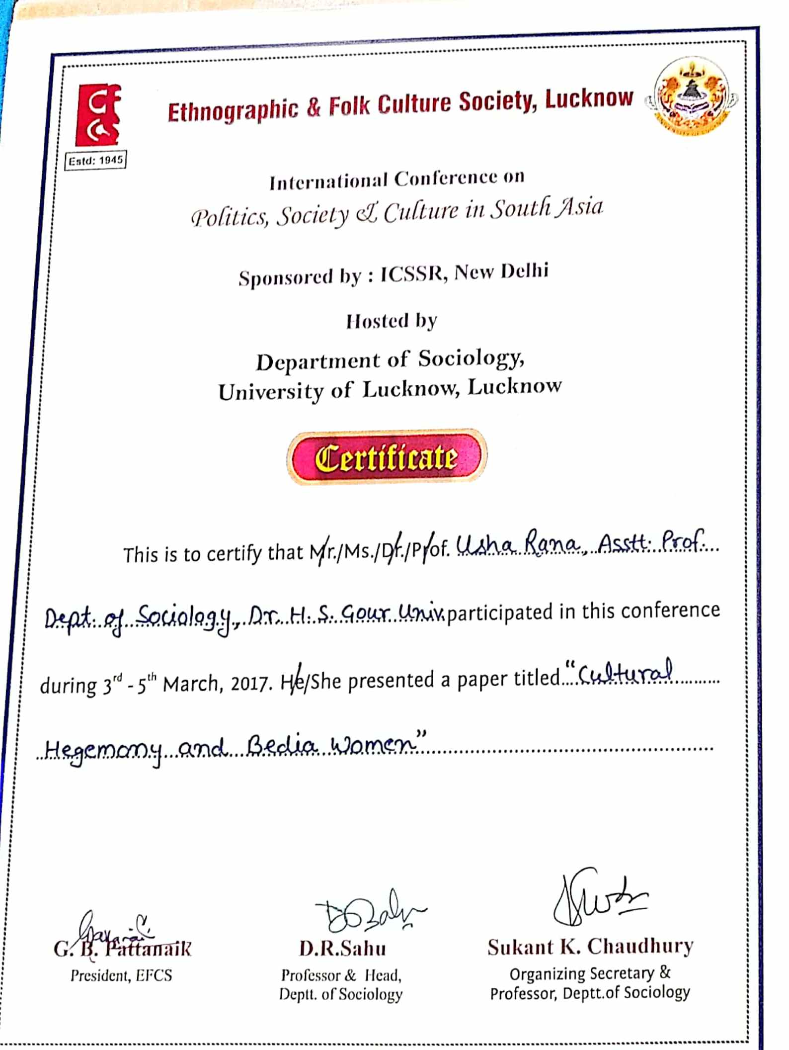 | Dr. Usha Rana | “Cultural Hegemony and Bedia Women”, International conference at Ethnographic & Folk Culture Society, Lucknow, Sponsored by: ICSSR, New Delhi and Dept. of sociology, University of Lucknow, Lucknow, 3rd to 5th March 2017. | 03-03-2017 To 05-03-2017 | Download |