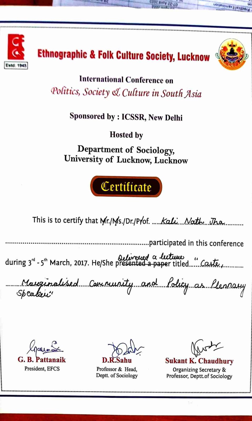 | Dr. Kali Nath Jha | Delivered and Invited Lecture on Caste, Marginalised , Community and Policy as Plennary Speaker (International Conference on Politics, Society and Culture in south Asia) organised by Ethnographic and Folk Culture Society, Lucknow | 03-03-2017 To 05-03-2017 | Download |