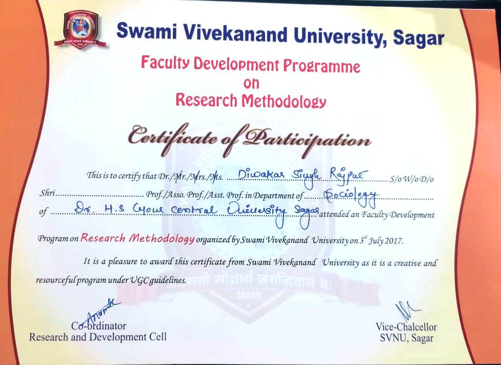 | Prof. Diwakar Singh Rajput | Faculty Development Programme on Research Methodology Swami Vivekanand University, Sagar M.P. | 03-07-2017 | Download |