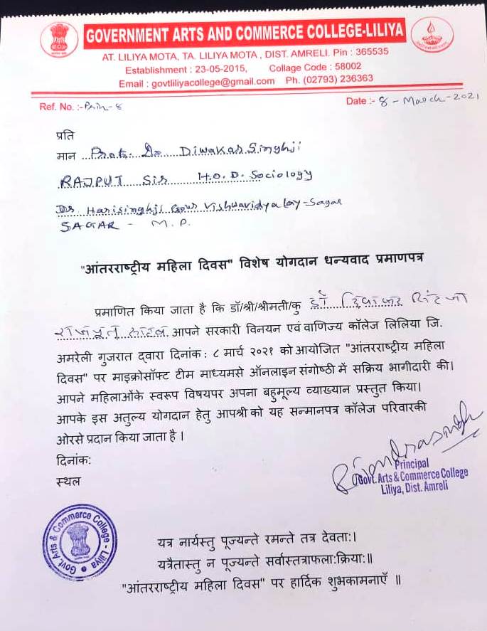 | Prof. Diwakar Singh Rajput | Government Arts and Commerce college-Liliya Mota District Amreli "आंतरराष्ट्रीय महिला दिवस " | 07-03-2021 | Download |