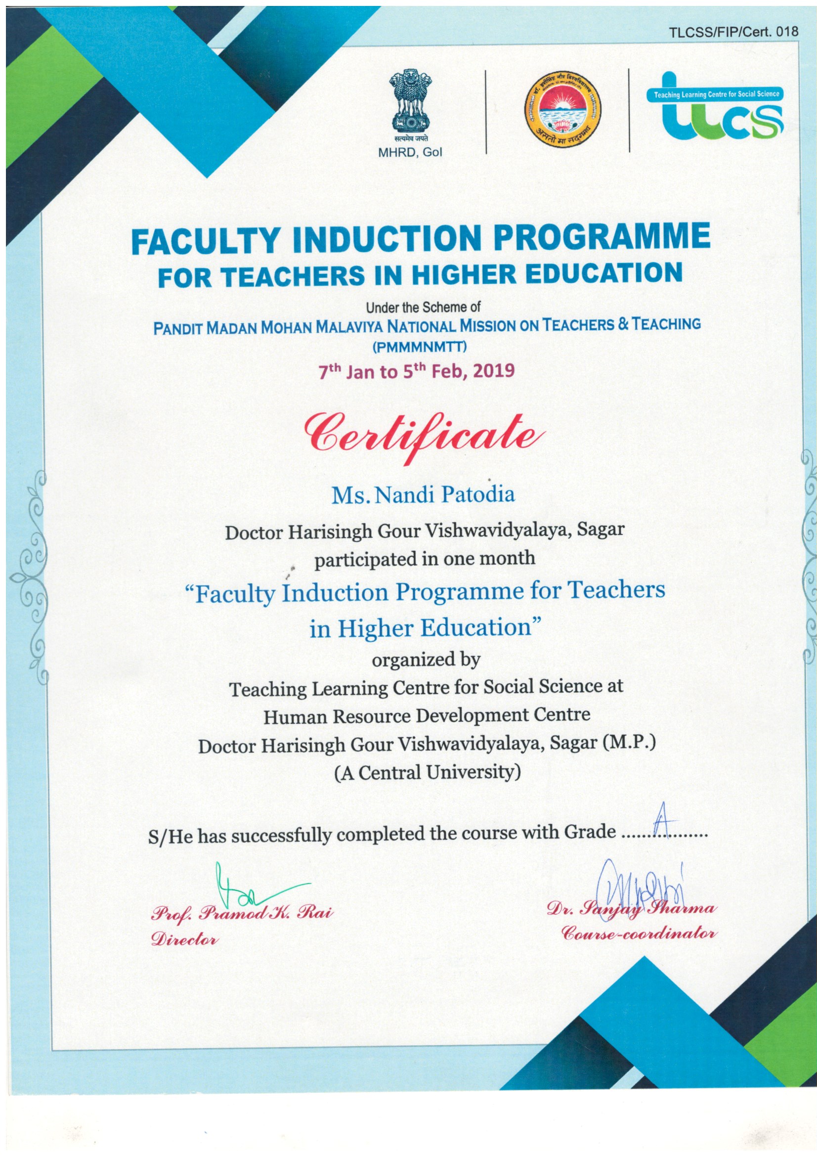 | Dr. Nandi Patodia | Faculty Induction Programme for Teacher in Higher Education, 07 Jan. to 05 Feb. 2019, Pandit Madan Mohan Malaviya National Mission on Teachers & Teaching. | 07-01-2019 To 05-02-2019 | Download |
