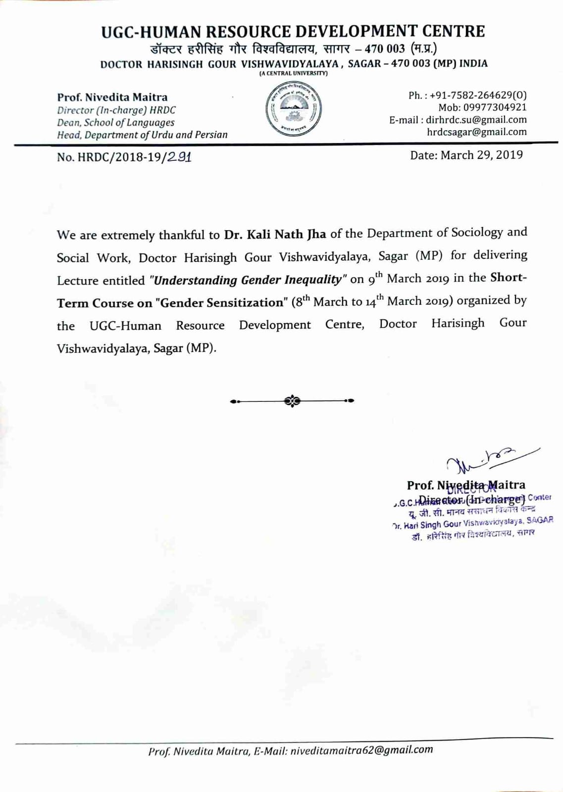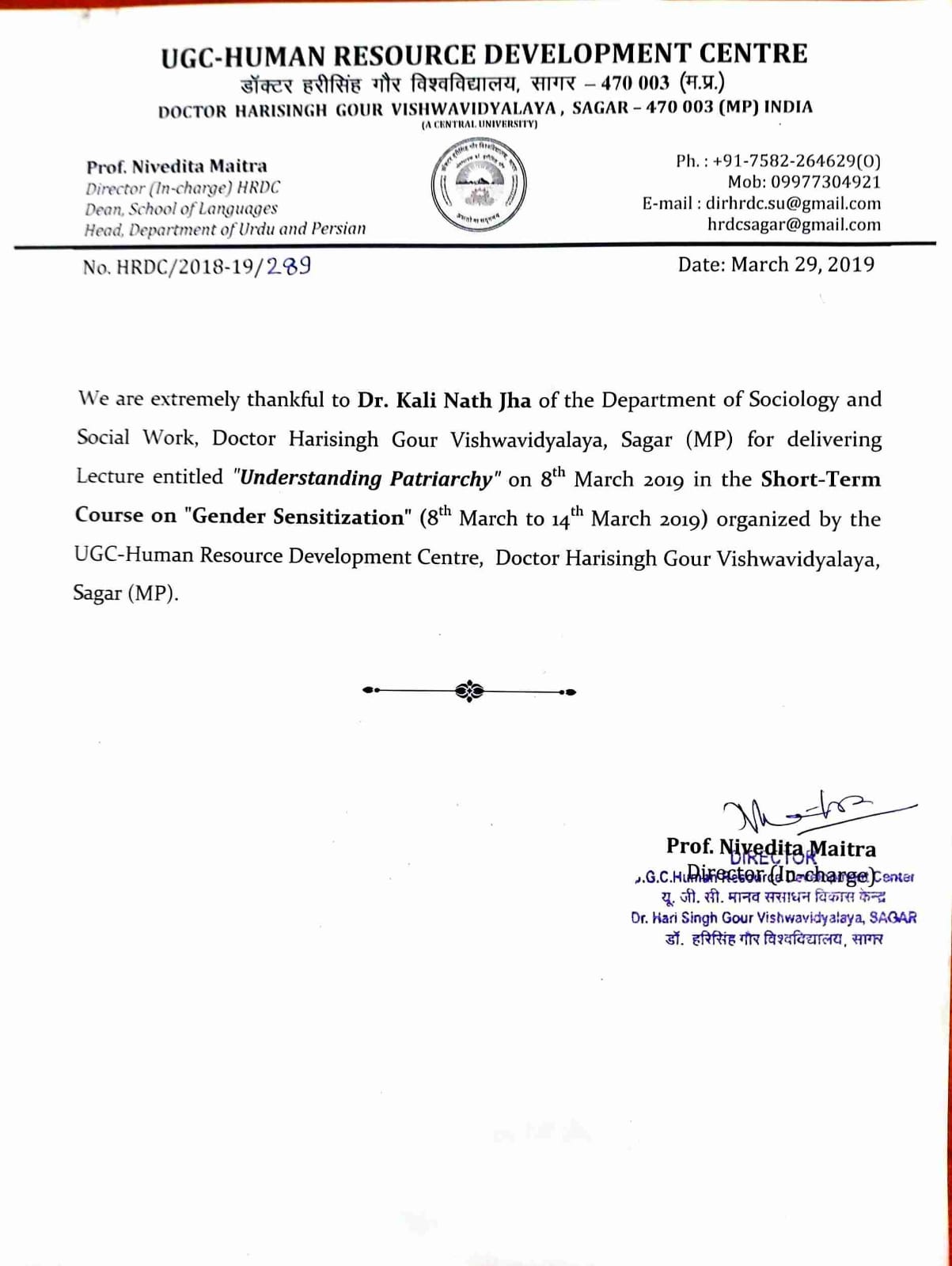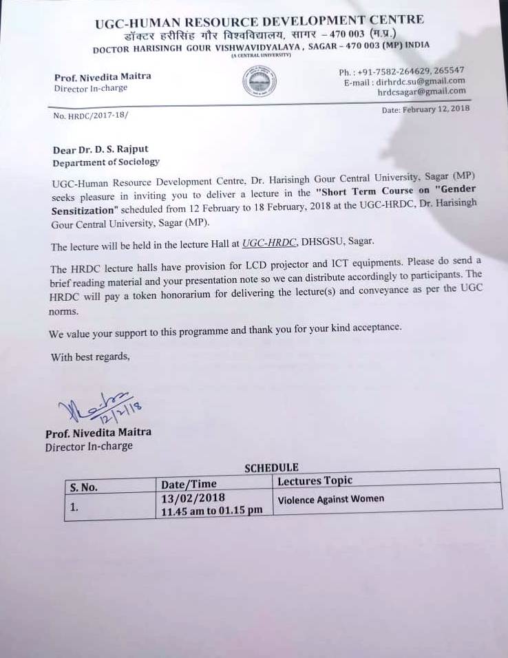 Delivered an Invited Lecture entitled 'Gender Sensitive Language, Work Culture and Work Place' in the Short-Term Course on Gender Sensitization (08-14 March, 2019) organised by UGC-HRDC, Dr. Harisingh Gour Vishwavidyalay, Sagar |