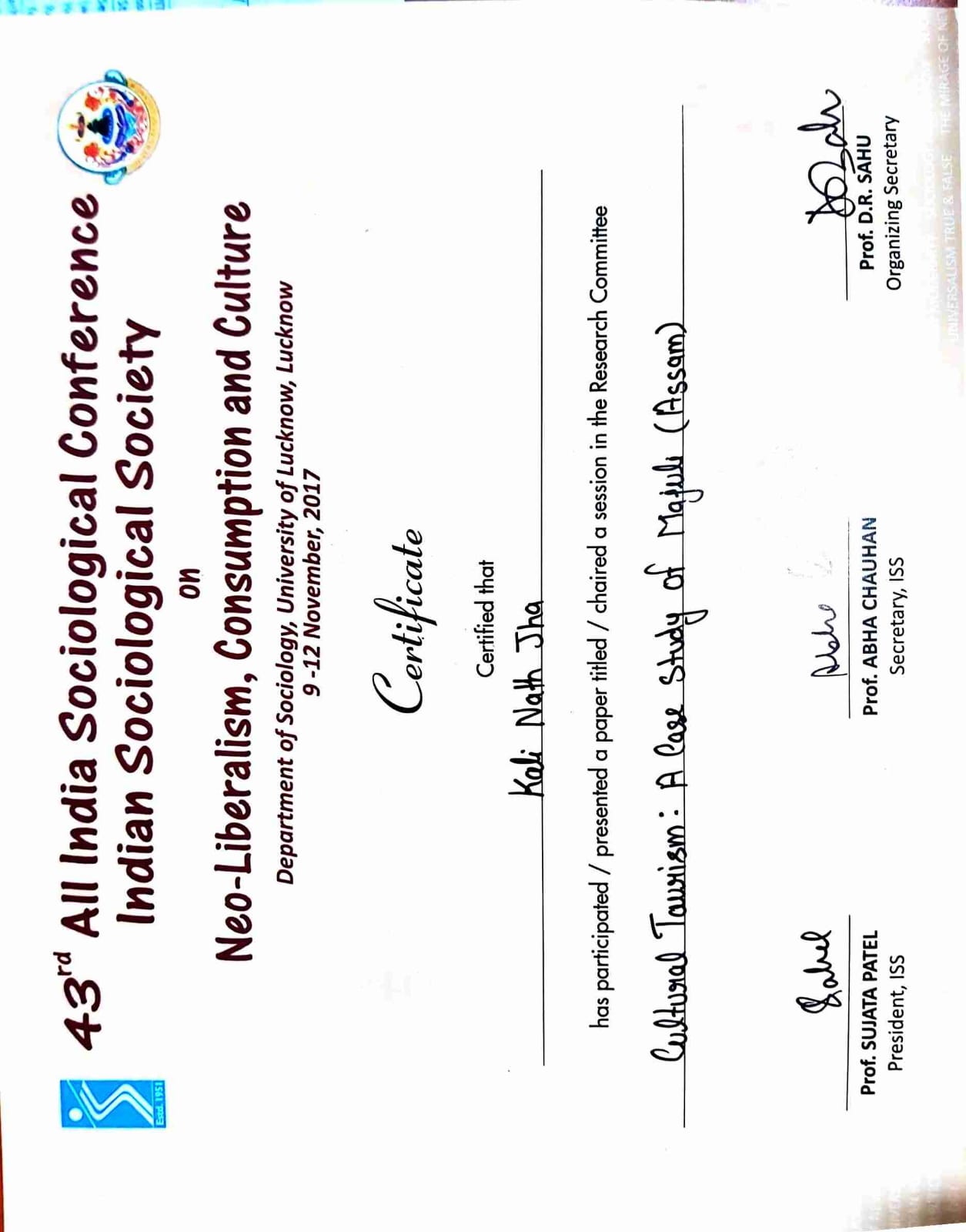 ‘Cultural Tourism: A Case Study of Majuli (Assam)’, 43 rd All India Sociological Conference on ‘Neo-Liberalism, Consumption and culture’, organized by University of Lucknow, (November 09-12, 2017) |