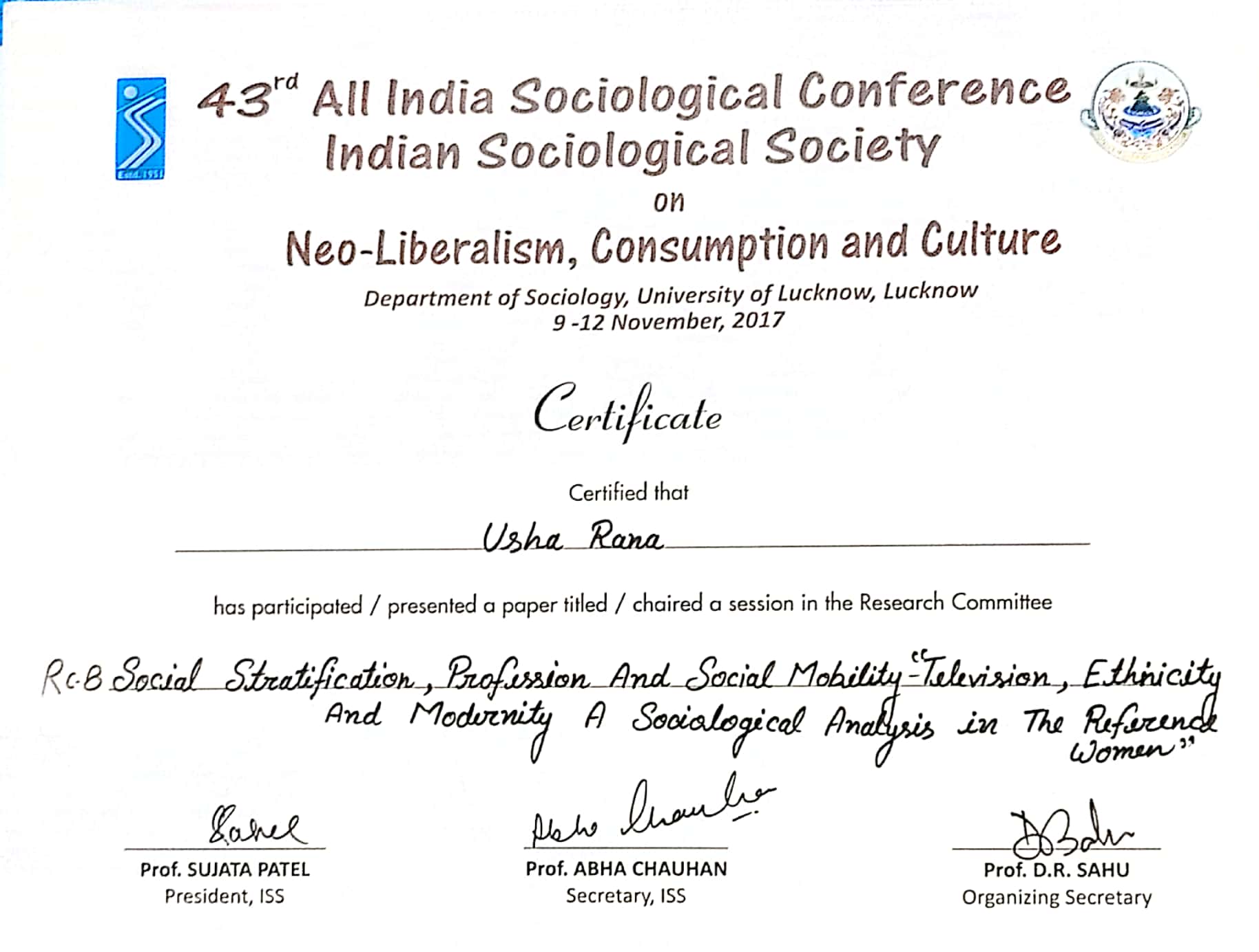 | Dr. Usha Rana | “Television, Ethnicity and Modernity: A Sociological Analysis in the reference of women”, 43rd All India Sociological Conference Organized by Indian Sociological Society and Dept. of Sociology, University of Lucknow, Lucknow, 9th to 12th Nov. 2017. | 09-11-2017 To 12-11-2017 | Download |