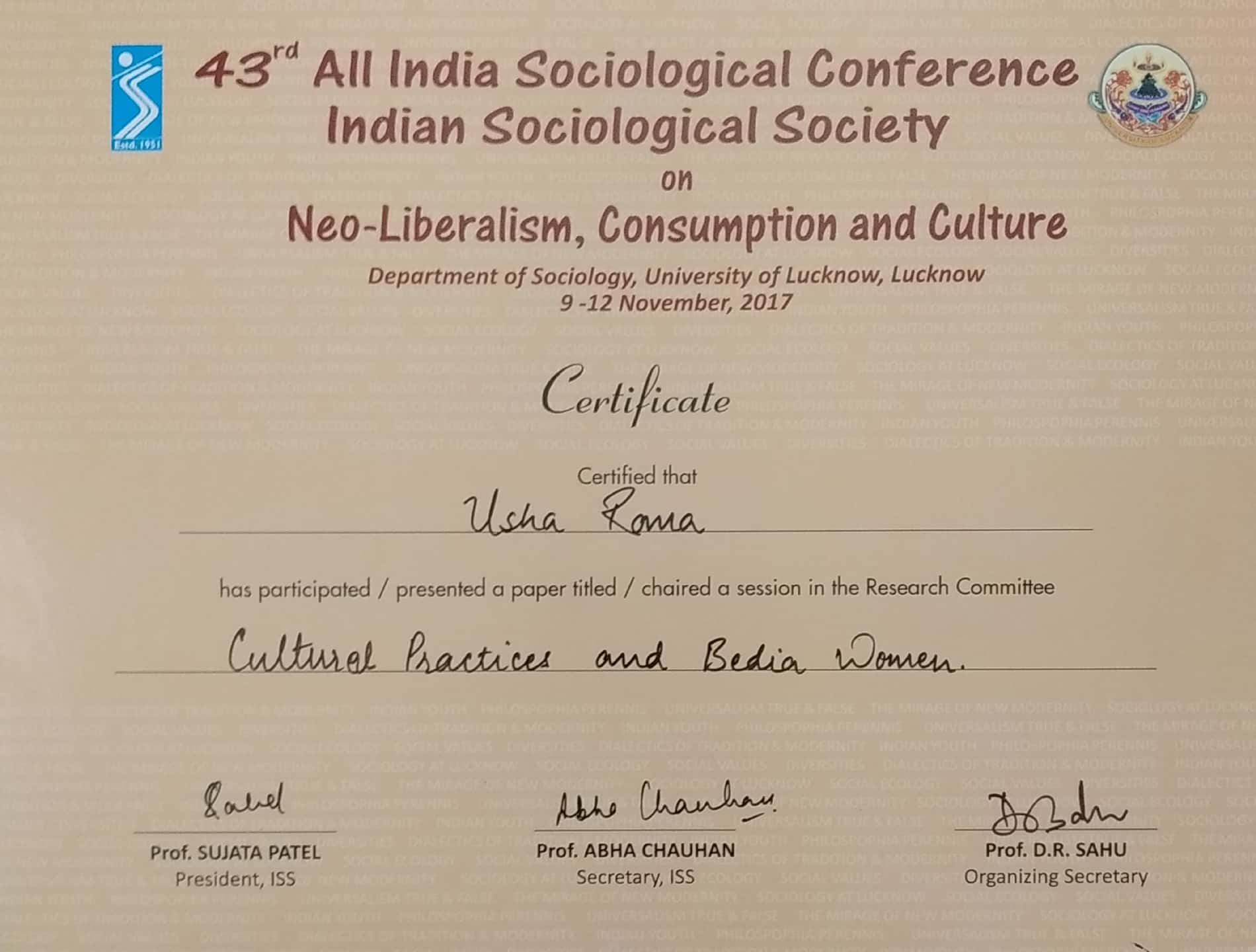 | Dr. Usha Rana | “Cultural practices and Bedia Women”, 43rd All India Sociological Conference Organized by Indian Sociological Society and Dept. of Sociology, University of Lucknow, Lucknow, 9th to 12th Nov. 2017. | 09-11-2017 To 12-11-2017 | Download |