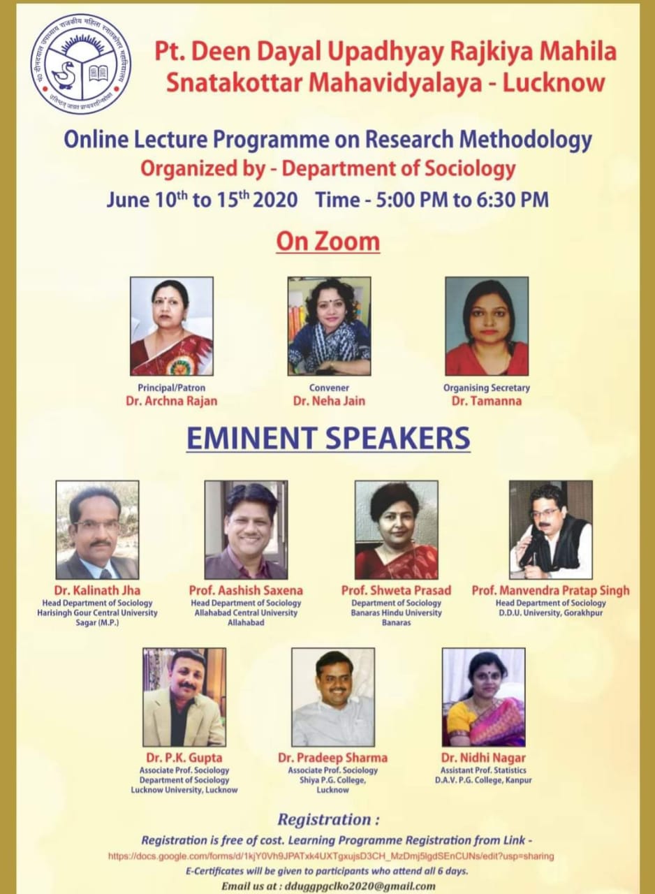 Delivered Invited Lecture on “Case Study from Sociological Perspective” on 10/06/2020, Online Lecture Series, organized by Pt. Deen Dayal Upadhyay Mahila Snatakottar Mahavidyalaya, Lucknow |