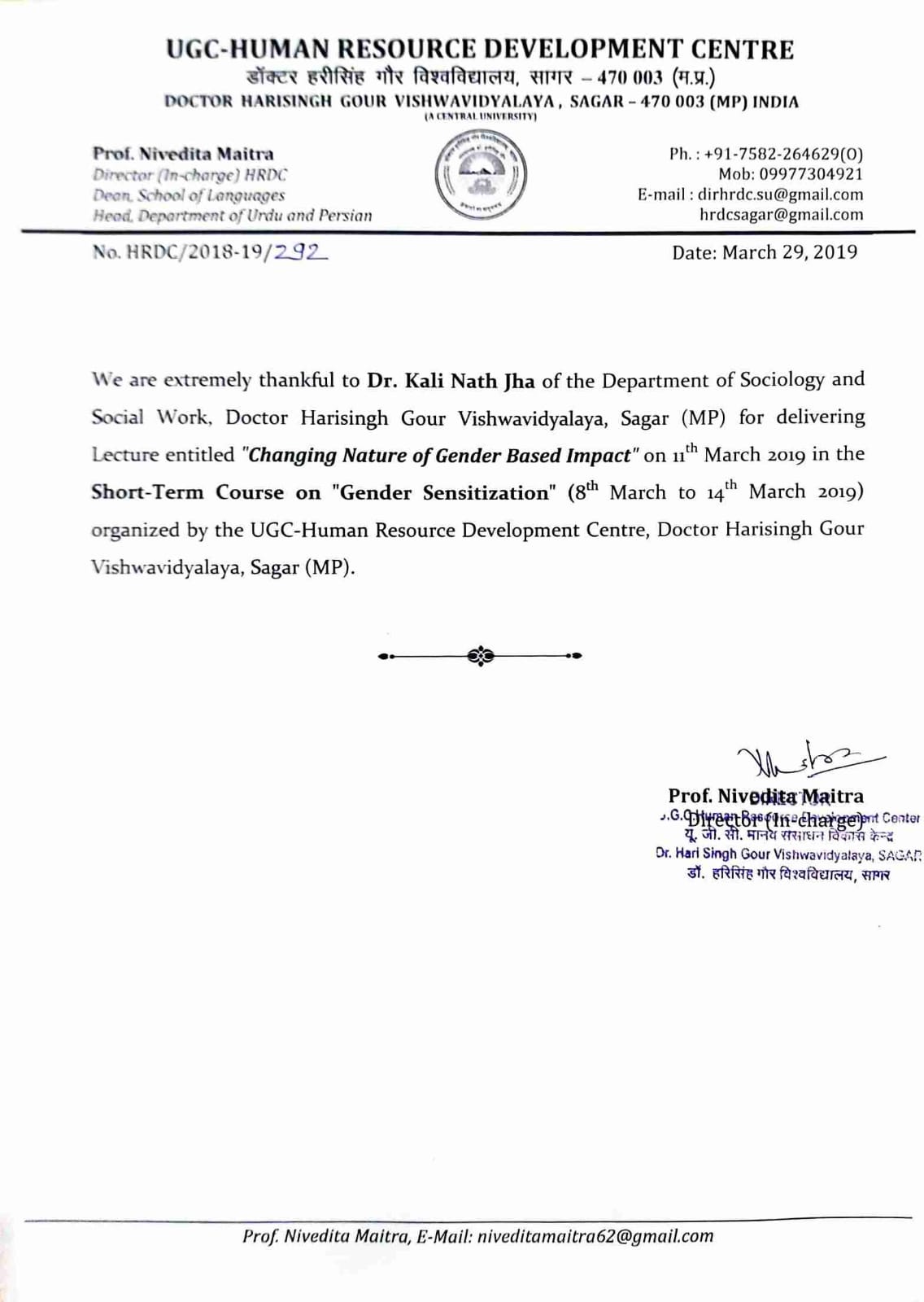 | Dr. Kali Nath Jha | Delivered an Invited Lecture entitled 'Understanding Gender Inequality' in the Short-Term Course on Gender Sensitization (08-14 March, 2019) organised by UGC-HRDC, Dr. Harisingh Gour Vishwavidyalay, Sagar | 09-03-2019 | Download |