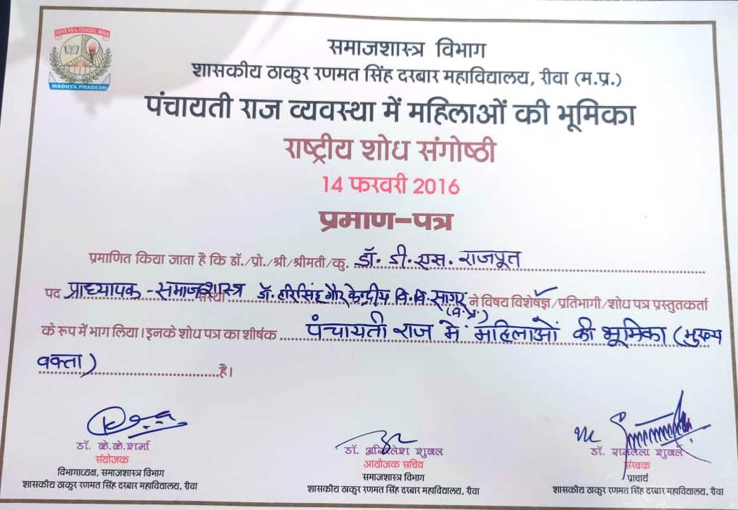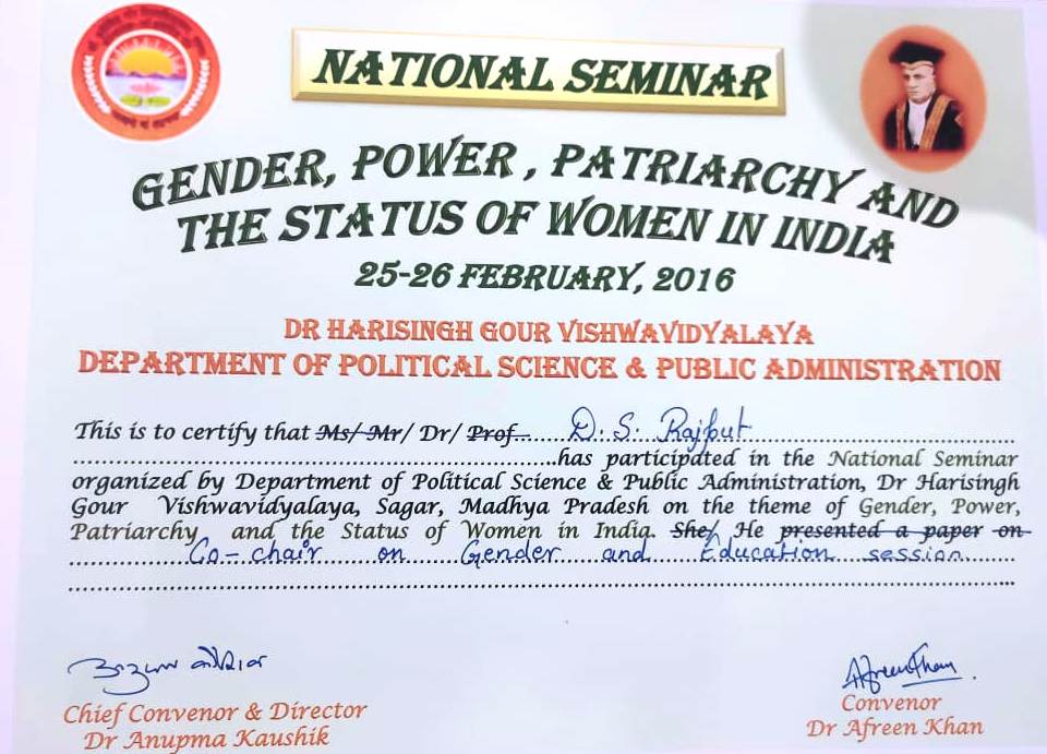 | Prof. Diwakar Singh Rajput | National Seminar Gender. Power, Patriarchy and The Status of Women in India 25-26 Feb 2016 Dr. Harisingh Gour Vishwavidyalaya Sagar M.P. | 25-02-2016 To 26-02-2016 | Download |
