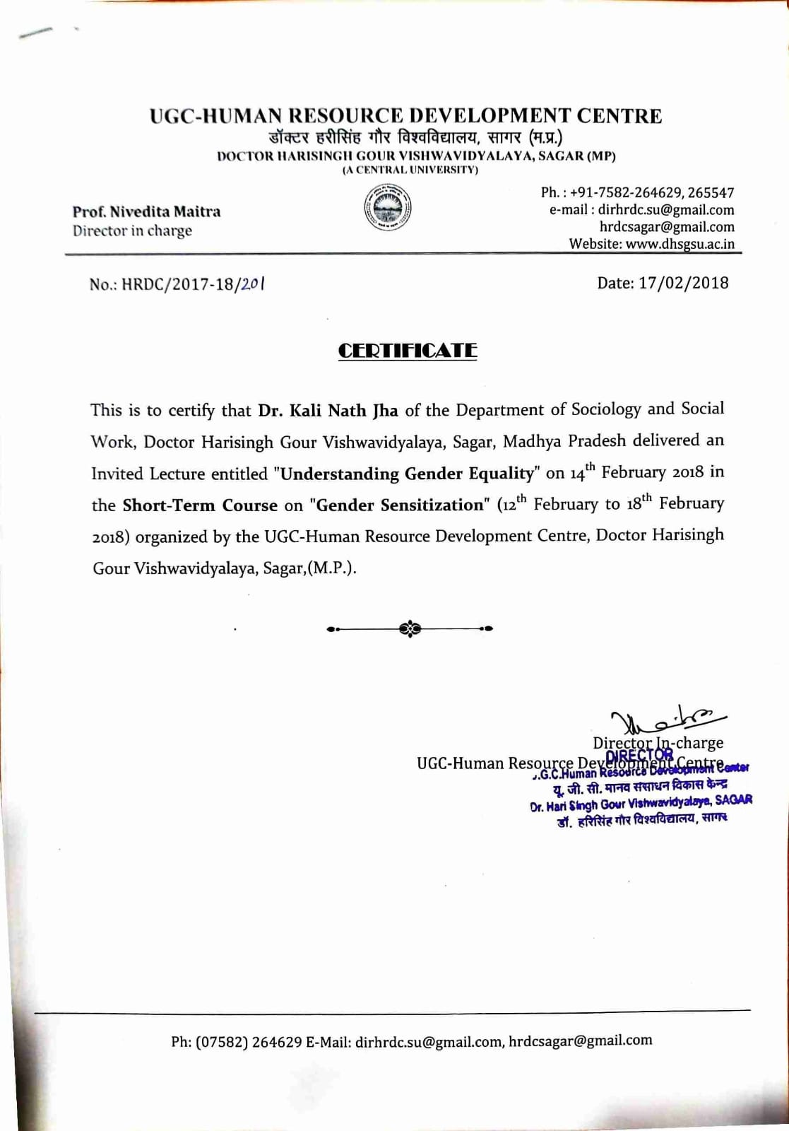 | Dr. Kali Nath Jha | Delivered an Invited Lecture entitled 'Understanding Gender Equality' in the Short-Term Course on Gender Sensitization (12-18 February, 2018) organised by UGC-HRDC, Dr. Harisingh Gour Vishwavidyalay, Sagar | 14/02/2018 | Download |
