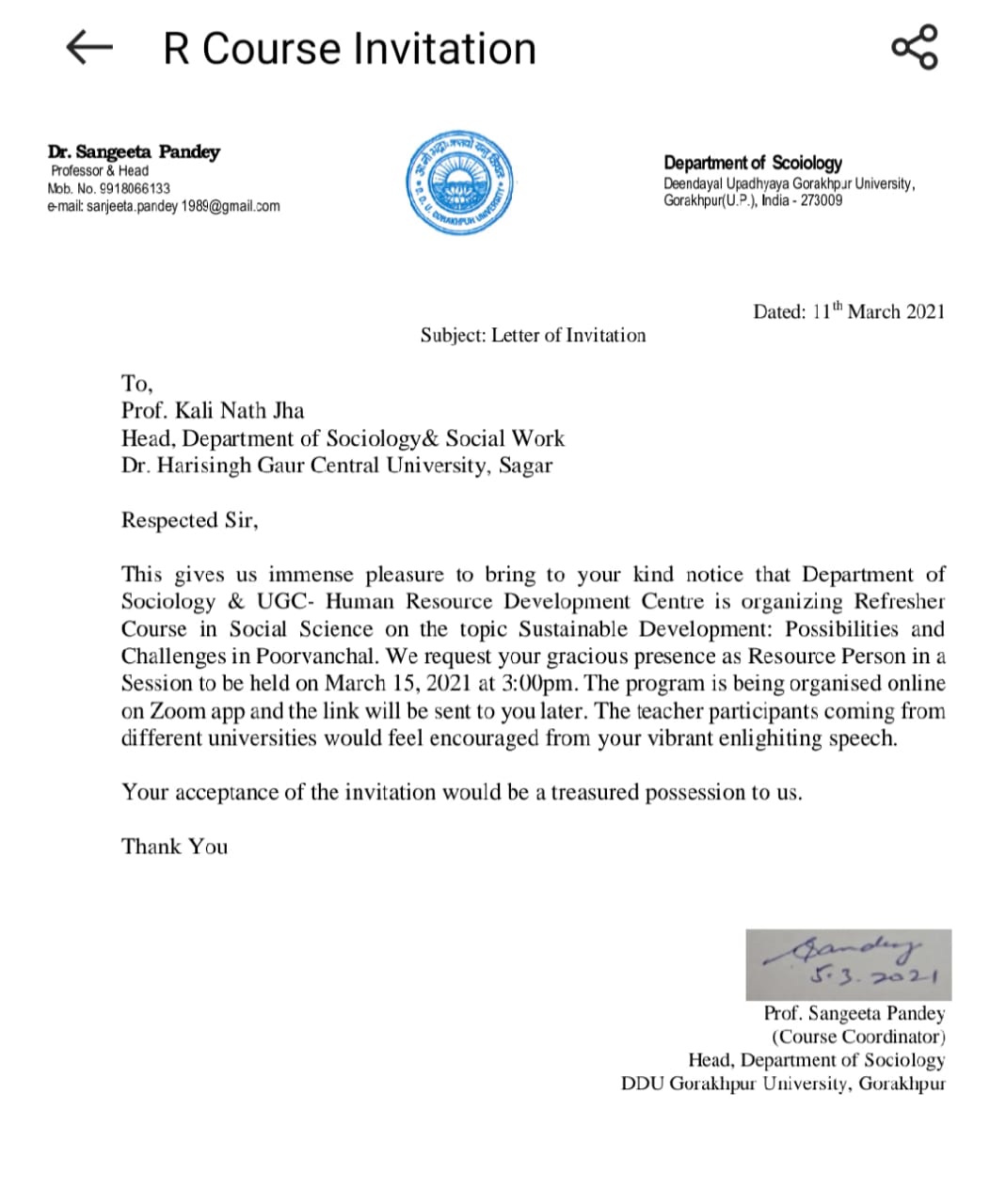 Delivered Invited online Lecture on “Women and Sustainable Development ” on 15/03 2021, ‘Refresher Course in Social Sciences’ organized by Department of Sociology & HRDC, DDU Gorakhpur University, Gorakhpur |