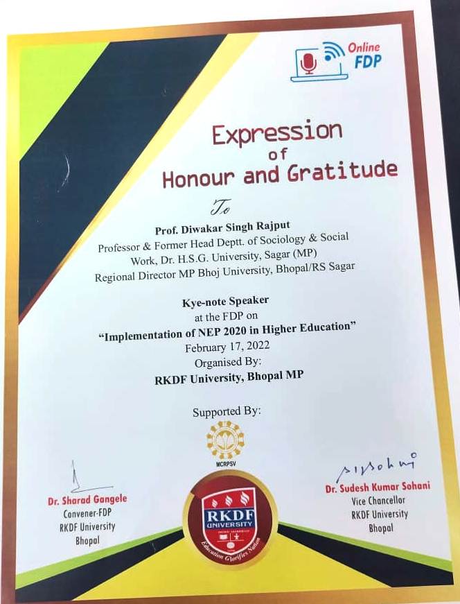 | Prof. Diwakar Singh Rajput | Expression of Honour and Gratitude Key-note Speaker at the FDP on "Implementation of NEP 2020 in Higher Education" RKDF University, Bhopal M.P. | 17-02-2022 | Download |