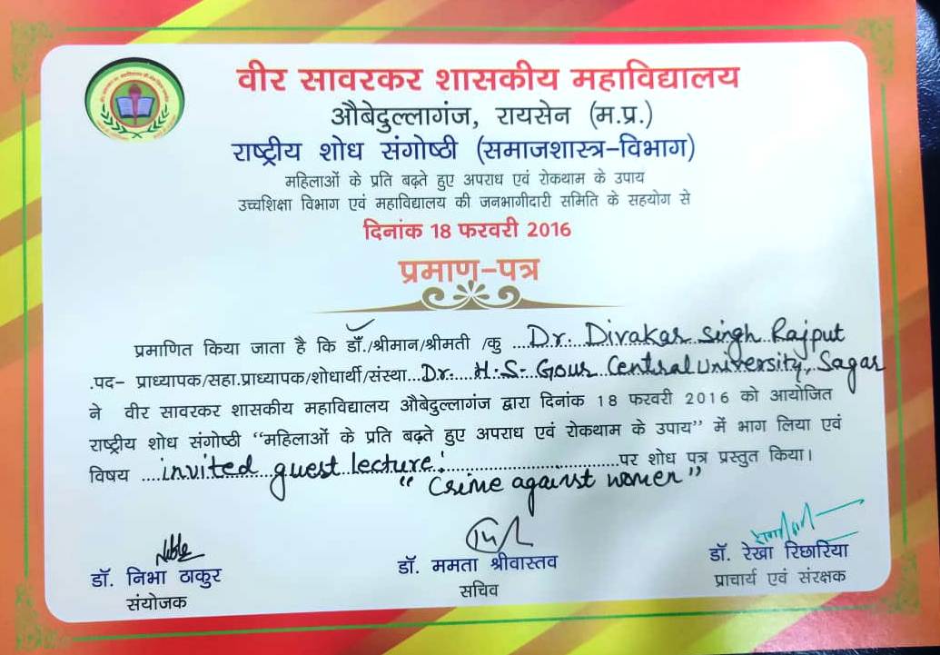 | Prof. Diwakar Singh Rajput | Invited guest lecture "Crime against women" Veer Savarkar Government College, Obedullaganj Raisen | 18-02-2016 | Download |