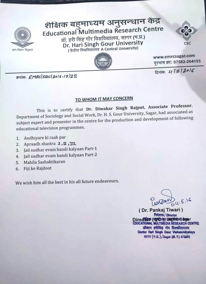| Prof. Diwakar Singh Rajput | Associated as Subject Expert and Presenter in the Centre for the production and development of Education television programmes. Educational Multimedia Research Centre Dr. Harisingh Gour University Sagar M.P. | 04-05-2016 | Download |