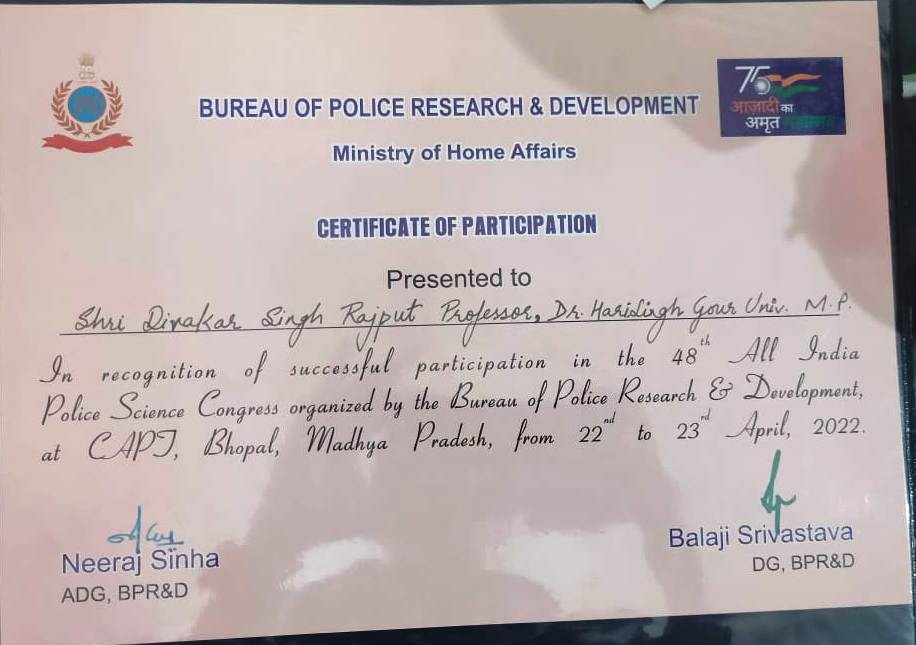 | Prof. Diwakar Singh Rajput | Participation in the 48th All India Police Science Congress organized by the Bureau of Police Research & Development, at CAPJ, Bhopal, MP | 22-04-2022 To 23-04-2022 | Download |