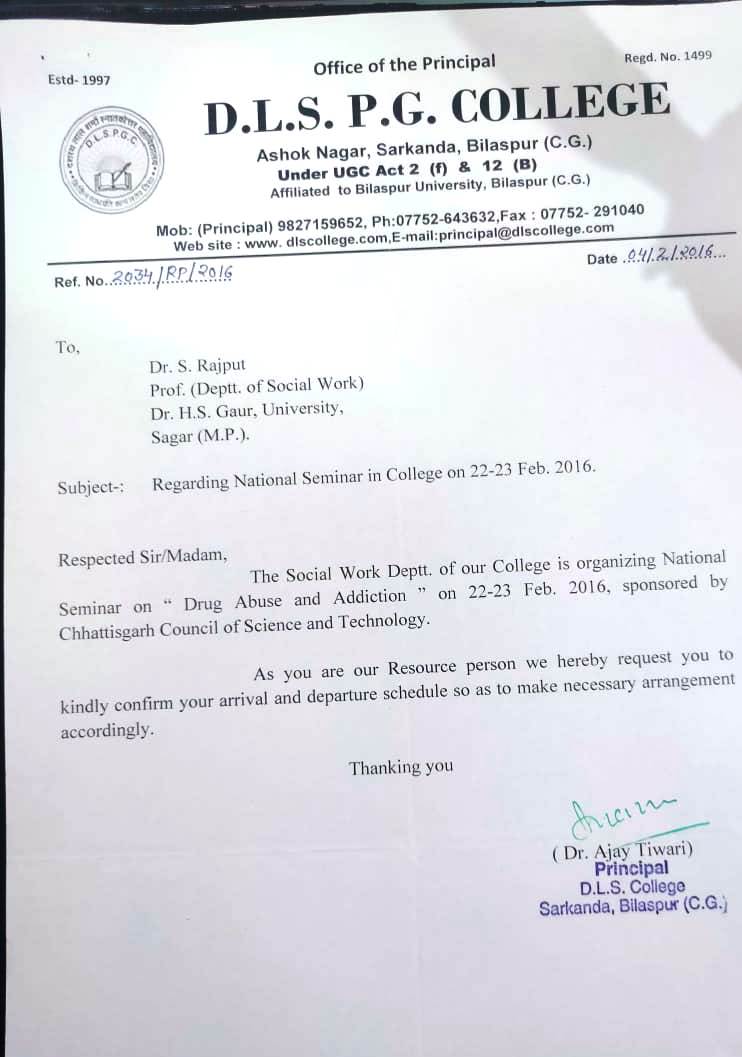 | Prof. Diwakar Singh Rajput | National Seminar "On Drug Abuse and Addiction" D.L.S. PG College Ashok Nagar, Sarkanda, Bilaspur(C.G.) | 22-02-2016 To 23-02-2016 | Download |