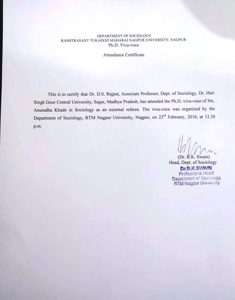 | Prof. Diwakar Singh Rajput | Attend Ph.D. Viva-Voce Department of Sociology Rashtrasant Tukadoji Maharaj Nagpur University, Nagpur | 23-02-2016 | Download |