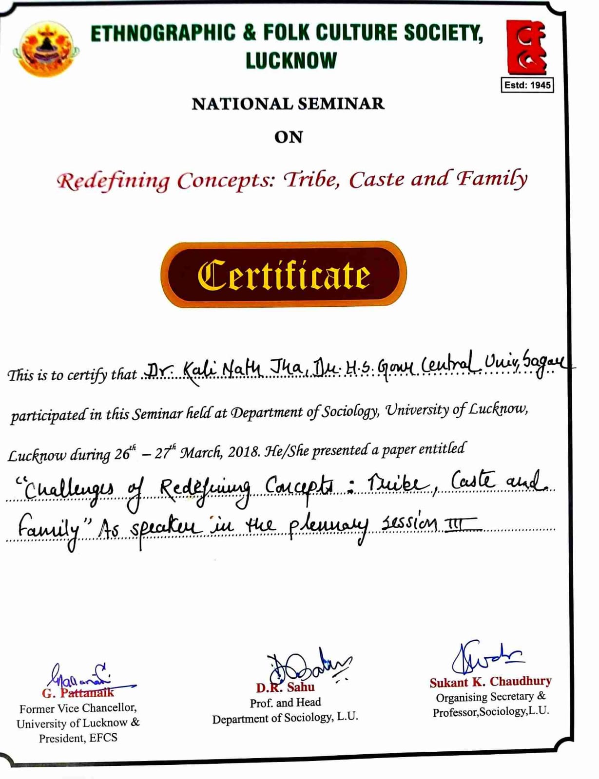 ‘Challenges of Redefining Concepts: Tribes, Caste and family’, As Speaker in the Plenary Session III, National Seminar, organized by University of Lucknow, (March 26-27, 2018) |
