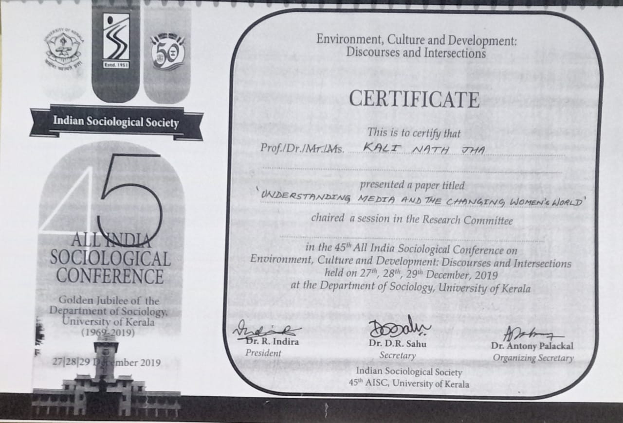 | Dr. Kali Nath Jha | Presented a Paper entitled 'Understanding Media and the Changing Women's World, 45th All India Sociological conference On Environment, Culture and Development: Discourses and Intersections, Organised by University of Kerala, Kerala | 27-12-2019 To 29-12-2019 | Download |