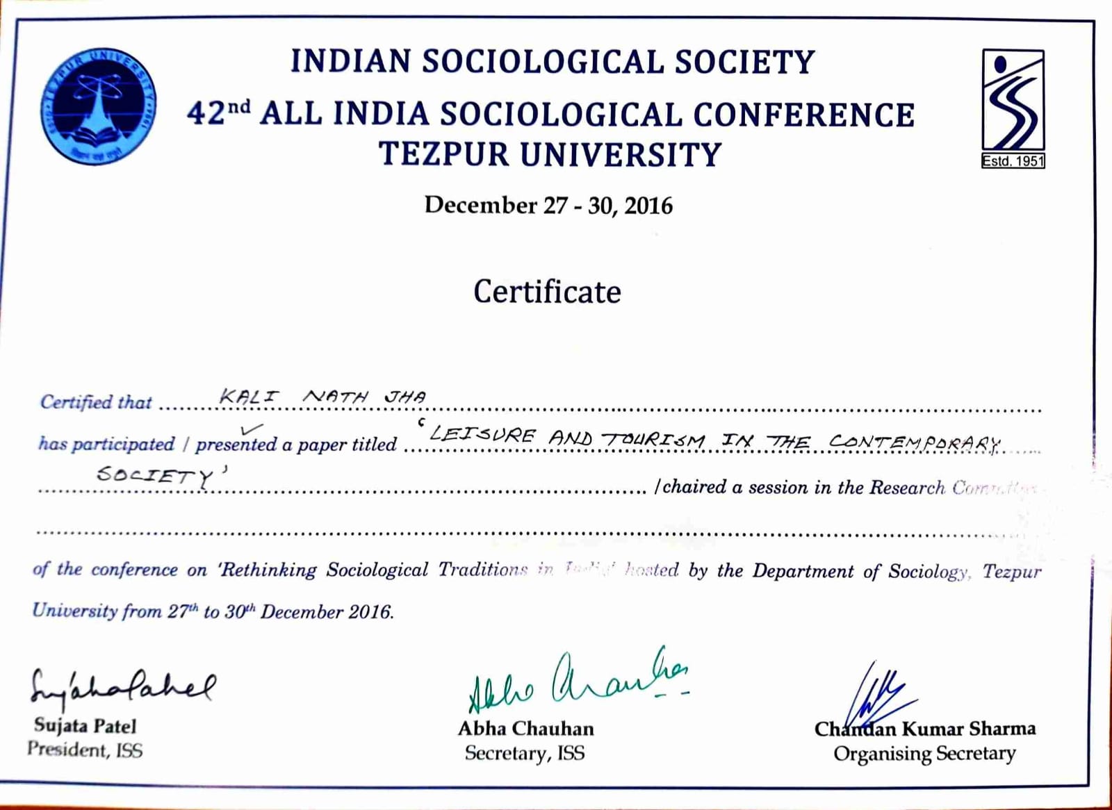‘Leisure and Tourism in the Contemporary Society’, 42 nd All India Sociological Conference on ‘Rethinking Sociological Traditions in India’, organized by Tejpur University (A Central University) and Indian Sociological Society, (December 27-30, 2016) |