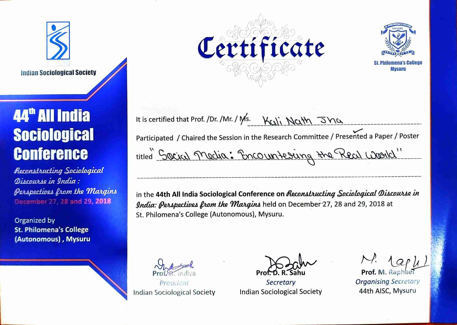 ‘Social Media: Encountering the Real world’, 44th All India Sociological Conference on ‘Reconstructing Sociological Discourse in India: Perspectives from the Margins’, organized by St. Philomena’s College (Autonomous), Mysuru (December 27-29, 2018) |