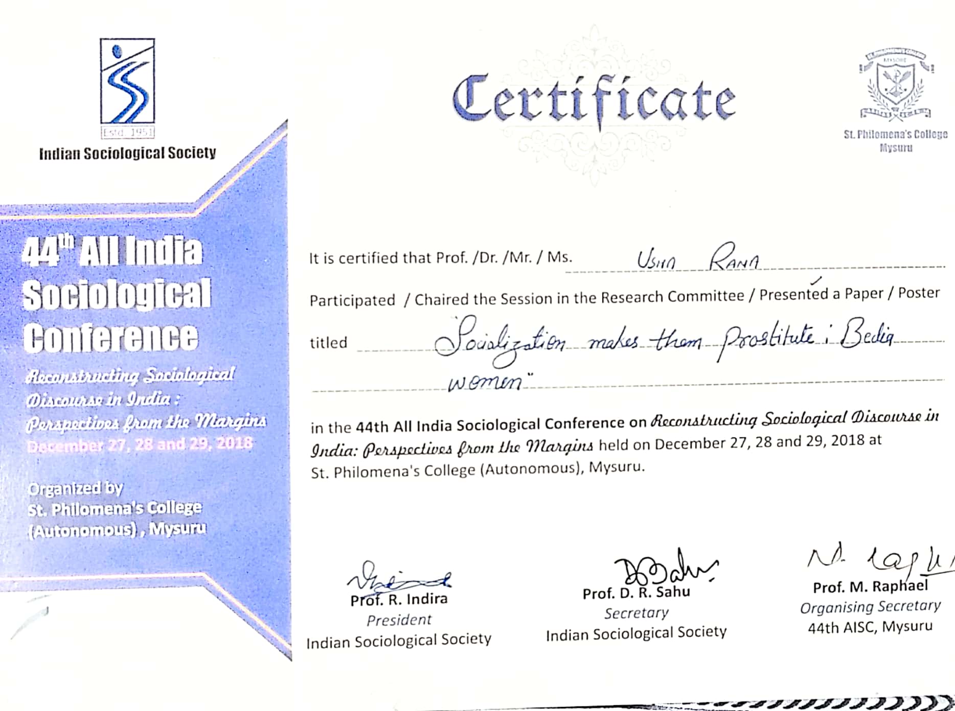 | Dr. Usha Rana | “Socialization makes them prostitute: Bedia women”, 44th all India sociological conference at Dept. of Sociology St. Philomena’s collage Mysuru, 27th to 29th Dec. 2018. | 27-12-2018 To 29-12-2018 | Download |