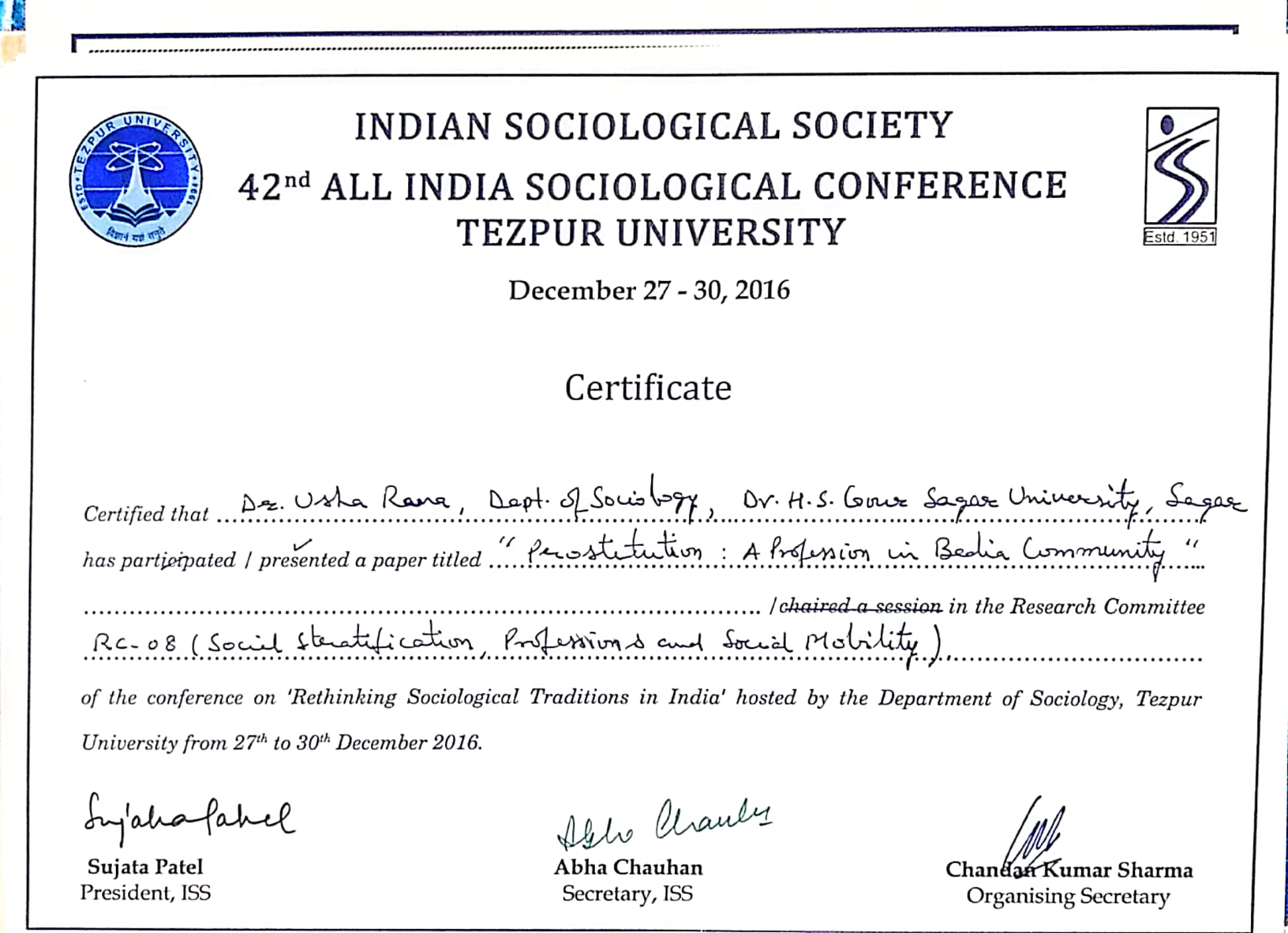 “Prostitution: A Profession in Bedia community”, 42nd All India Sociological Conference Organized by Indian Sociological Society, Tezpur University, Tezpur, 27th to 30th Dec. 2016. |