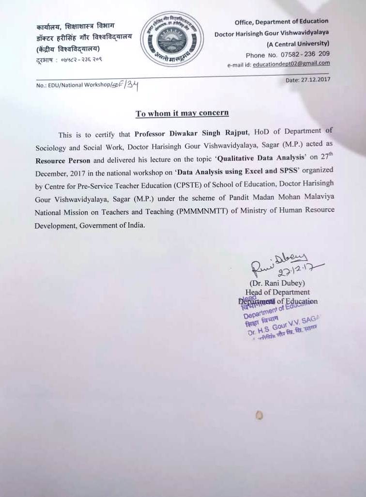 | Prof. Diwakar Singh Rajput | Delivered Lecture in "Qualitative Data Analysis" on 27th Dec, 2017 in the national workshop on "Data Analysis Using Excel and SPSS" Organized by Centre for Pre-Service Teacher Education(CPSTE) of School of Education, DHSGU Sagar M.P. | 27-12-2017 | Download |