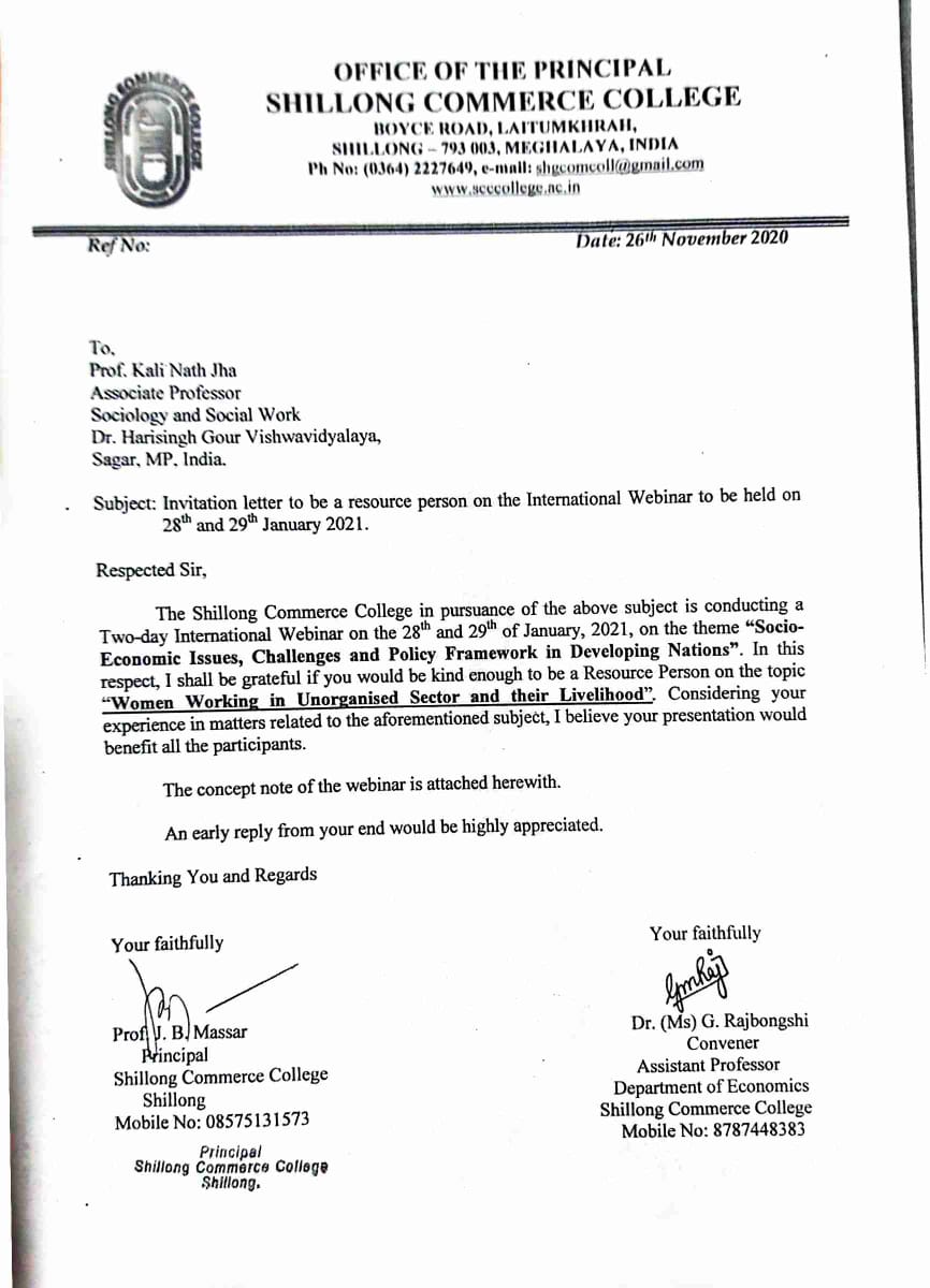 Delivered Invited online Lecture on “Women Working in Unorganized Sector and their livelihood” on 28/01/2021, A Two-day International Webinar on the theme ‘Socio-Economic Issues, Challenges and Policy Framework in Developing Nations’ organized by Shillong Commerce College, Shillong, Meghalaya, (January 28-29,2021) |