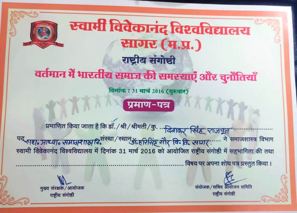 | प्रो- दिवाकर सिंह राजपूत | स्वामी विवेकानंद विश्वविद्यालय सागर म.प्र. राष्ट्रीय संघोष्ठी भारतीय समाज की समस्याए और चुनोतियाँ | 31-03-2016 | Download |