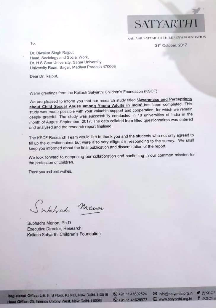 | Prof. Diwakar Singh Rajput | "Awareness and Perceptions about Child Sexual Abuse among Young Adults in India" Research Kailash Satyarthi Children's Foundation | 31-10-2017 | Download |