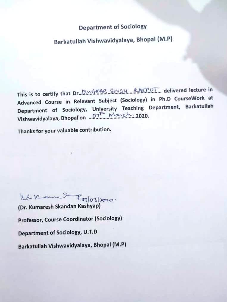 | Prof. Diwakar Singh Rajput | Delivered lecture in Advanced Course in Relevant subject(Sociology) in Ph.D. Course Work at Department of Sociology , University teaching department, Barkatullah Vishwavidyalaya, Bhopal M.P. | 07-03-2020 | Download |
