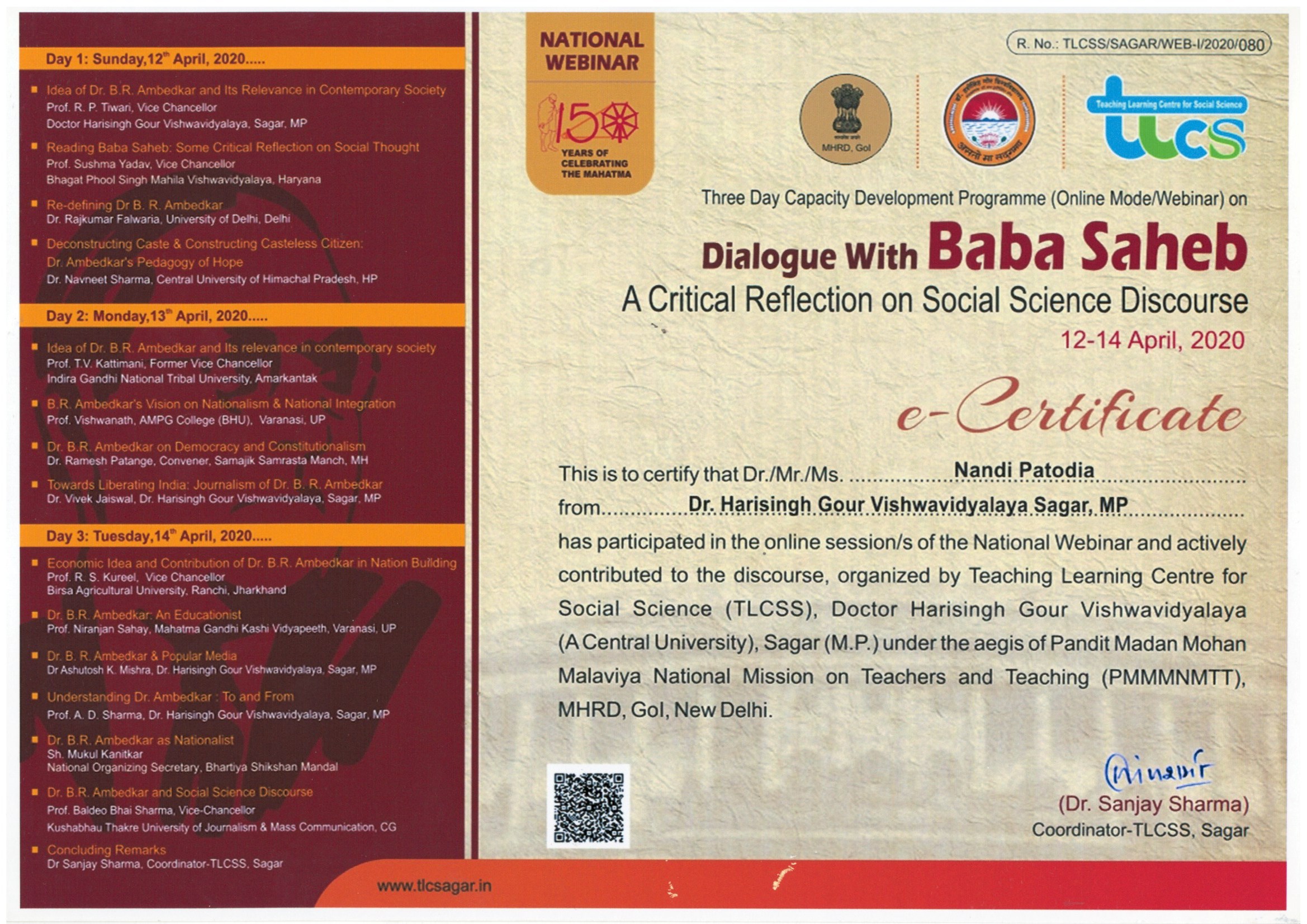 | Dr. Nandi Patodia | Dialogue with Baba Saheb : A Critical Reflection on Social Science Discourse, 12-14 April 2020, Organized by Teaching Learning Centre for Social Science, Doctor Harisingh Gour Vishwavidyalaya (A Central University), Sagar (M.P.). | 12-04-2020 To 14-04-2020 | Download |